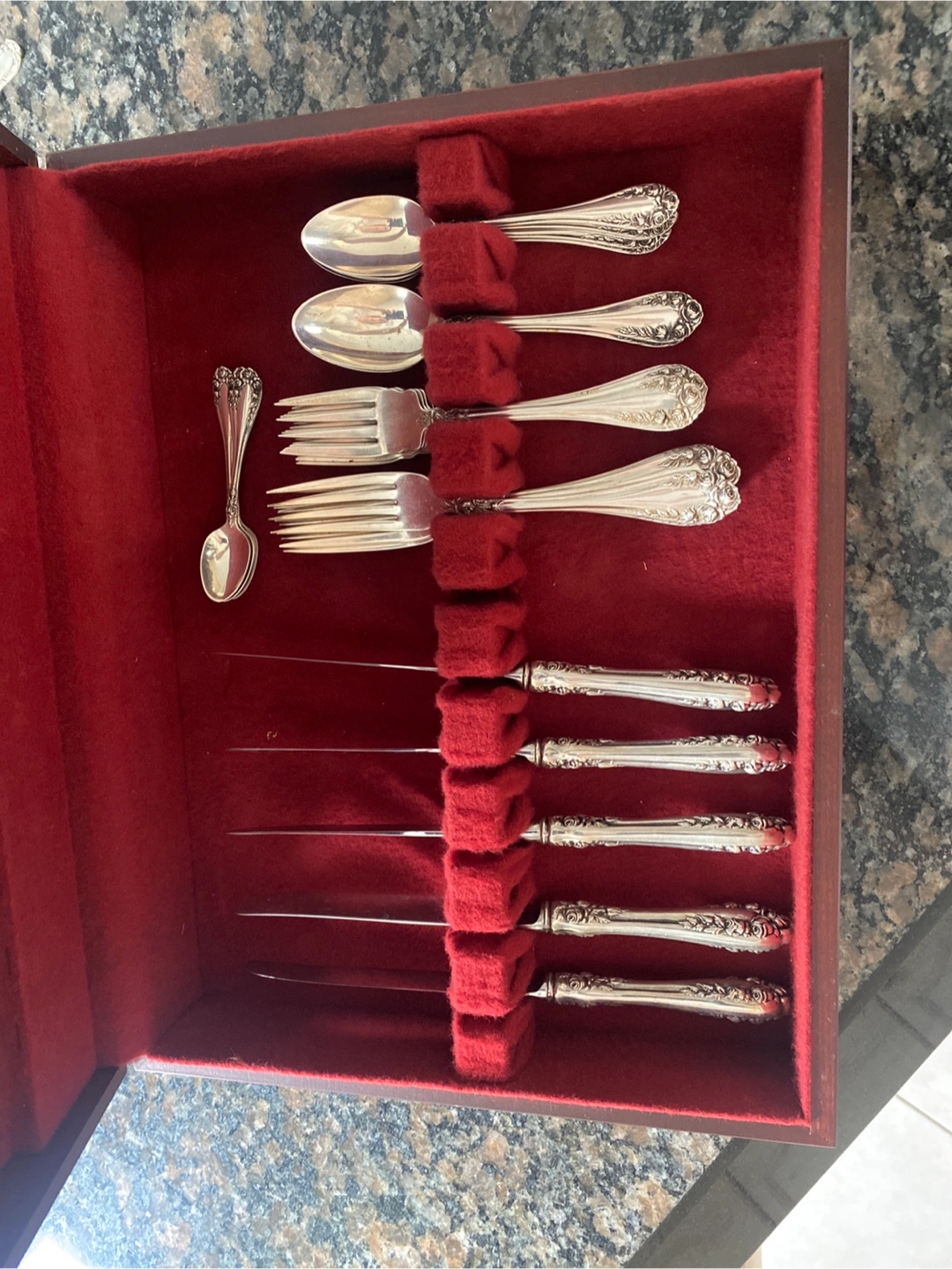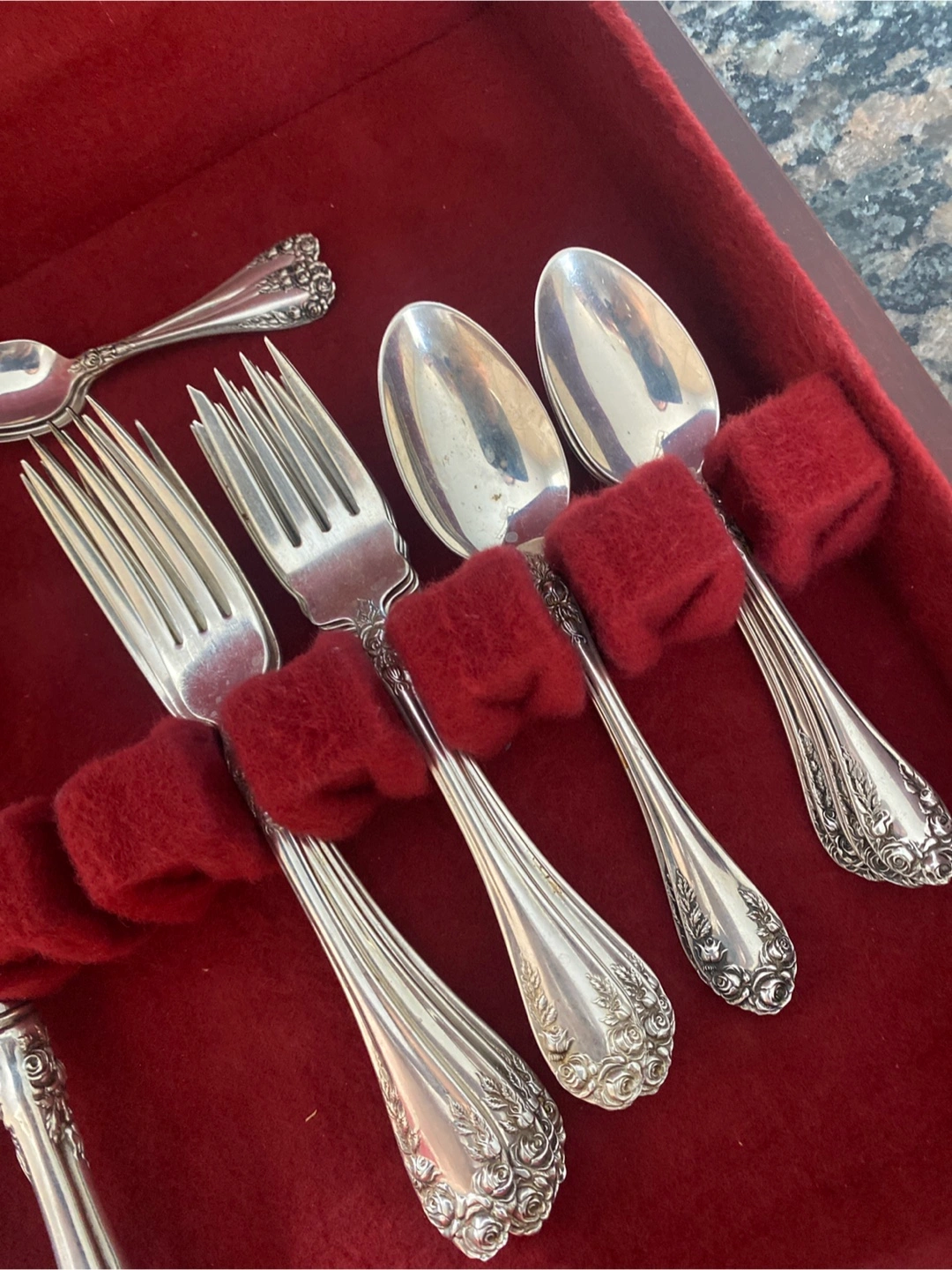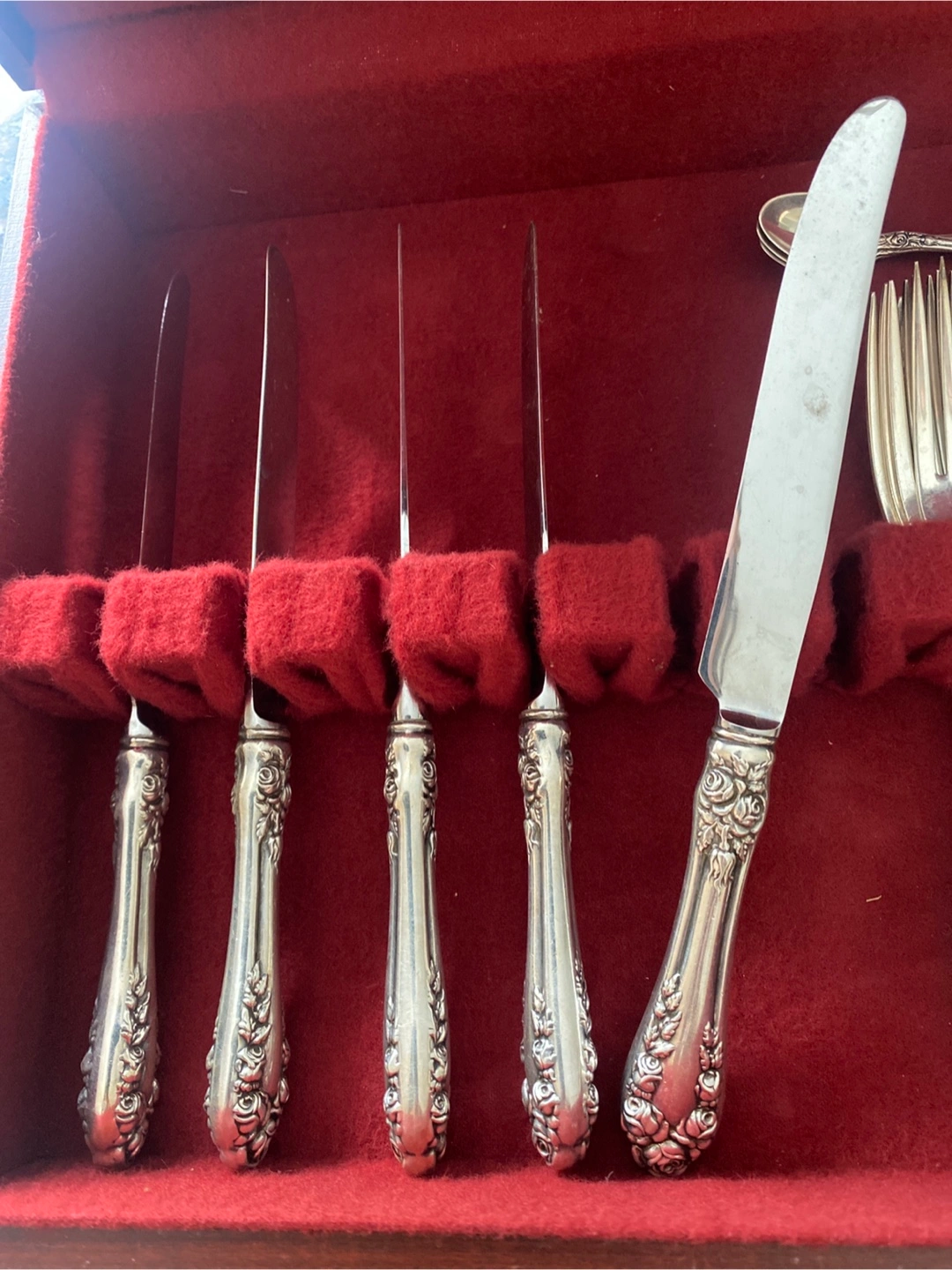 Selling a vintage silverware set in its original wooden box! The set includes spoons, forks, and knives. Perfect for adding a touch of elegance to your dining experience. NORTHUMBRIA NORMANDY ROSE STERLING SILVER FLATWARE SET. Only the knives are stainless, the rest are sterling. The set consists of: