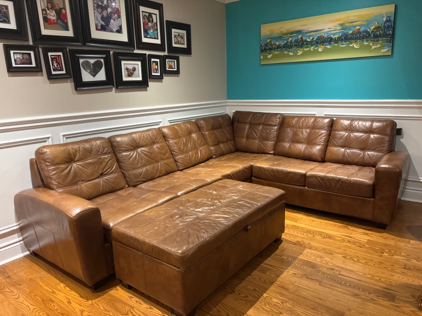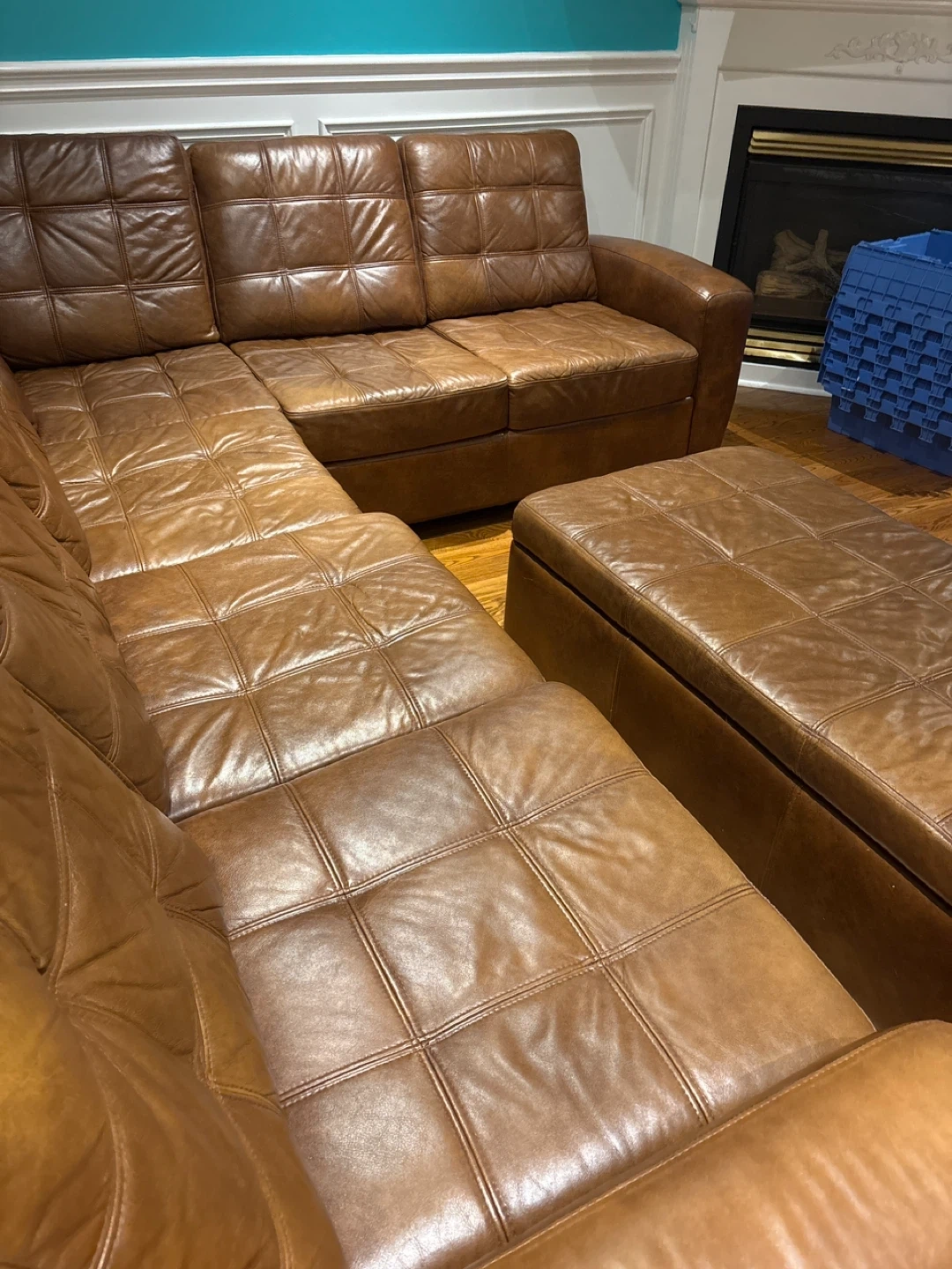 Brown Leather Sectional Sofa with Storage Ottoman