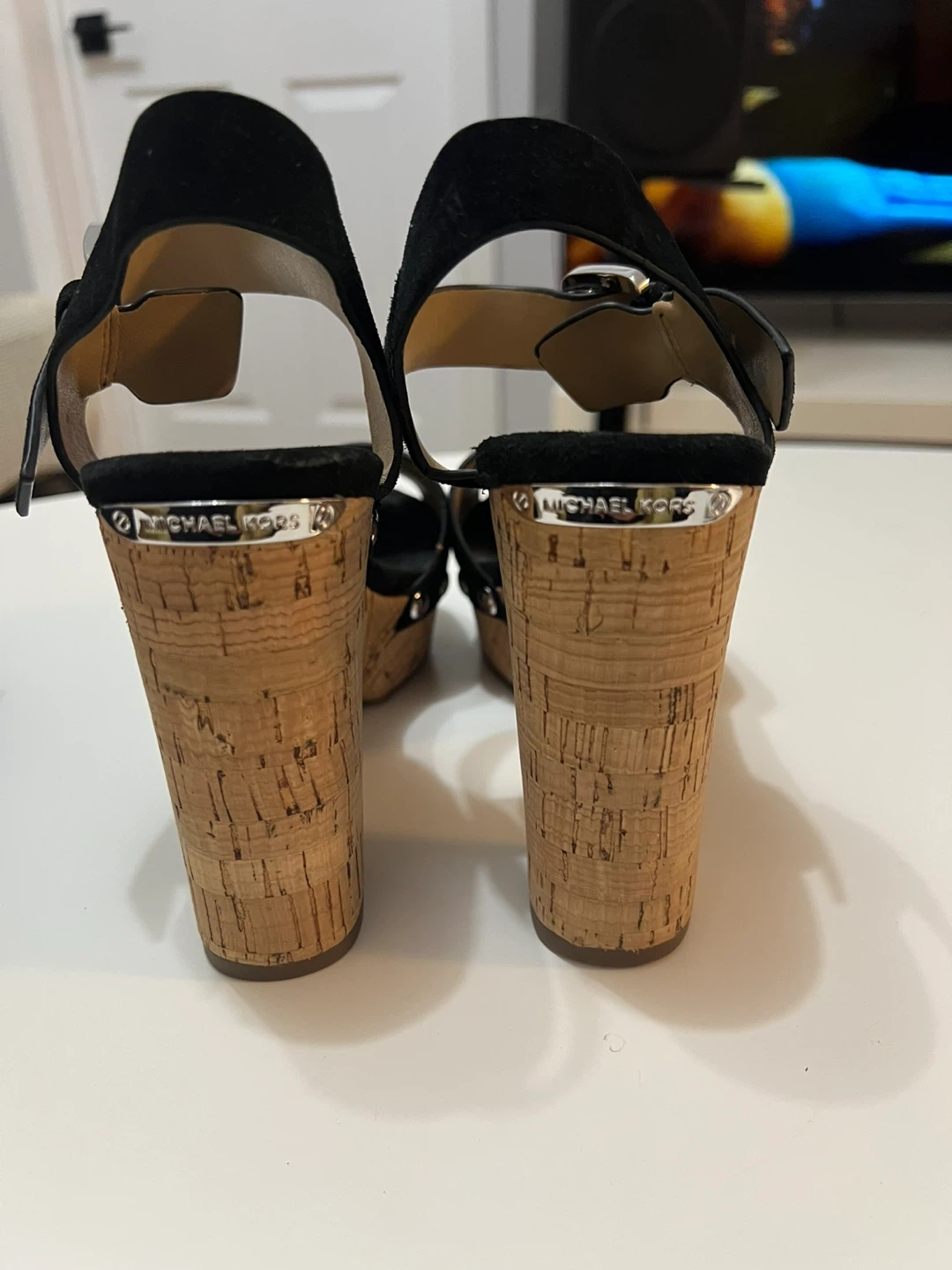 These Michael Kors sandals feature black suede straps and a cork wedge heel. They have an adjustable ankle strap with a silver buckle. Good as new condition. Just used once. Size 6.