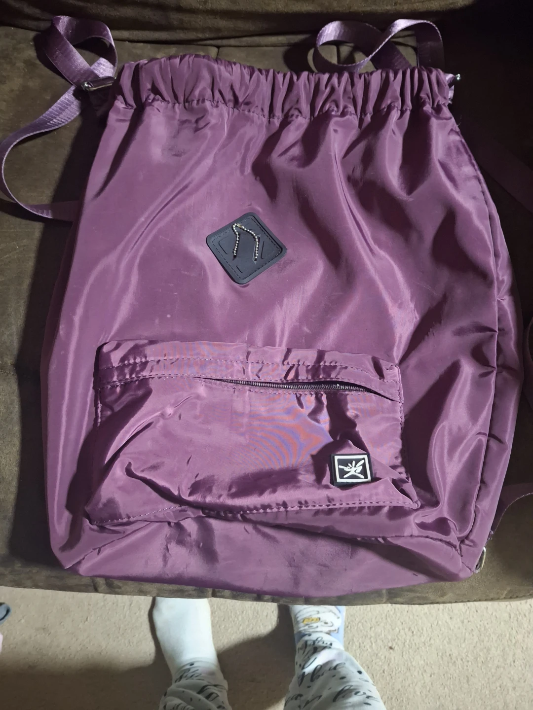 A purple drawstring backpack bag with a front zippered pocket. It has a cinched top and adjustable straps. This bag is made of a durable, lightweight material.