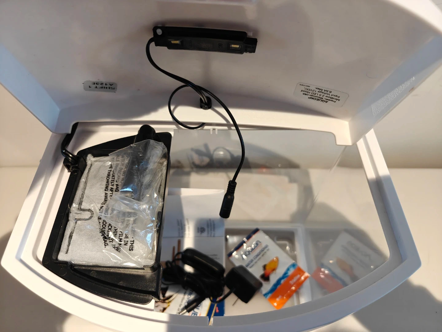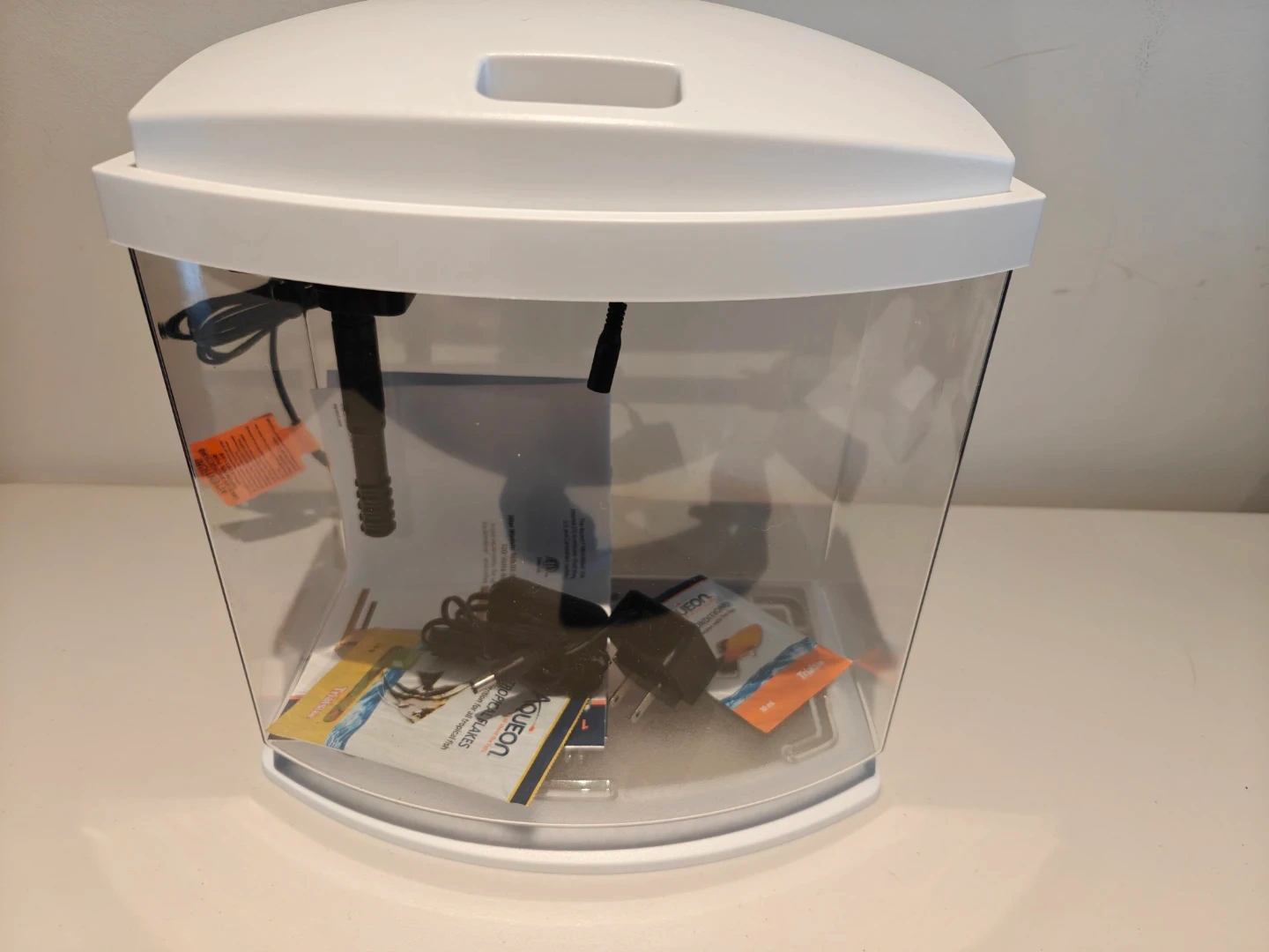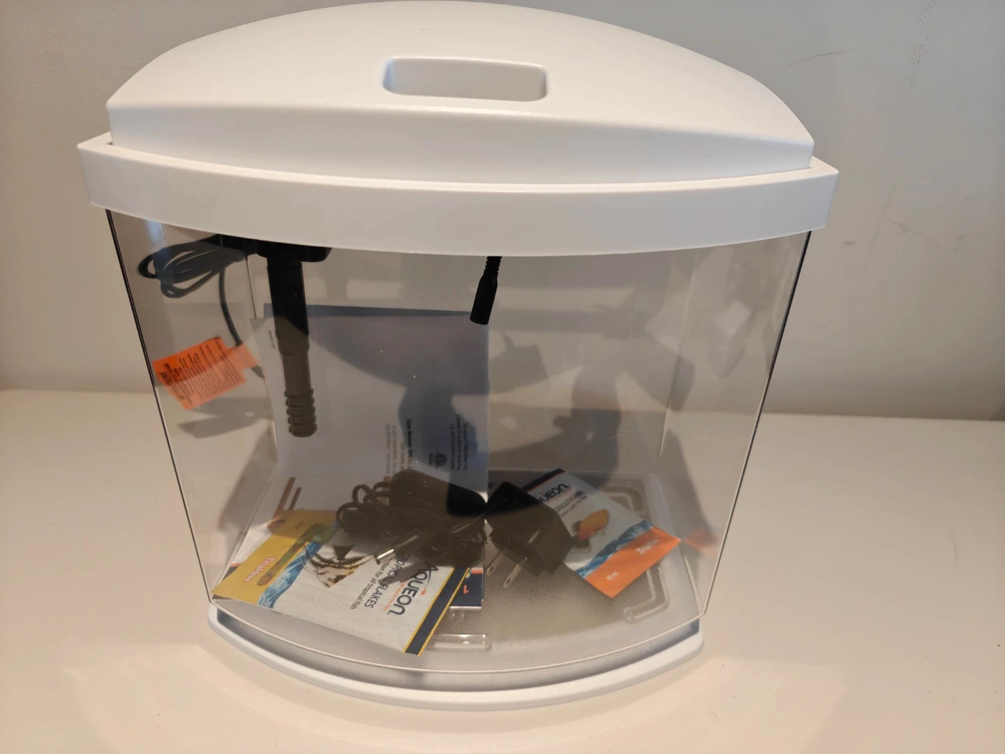 This is an Aqueon LED aquarium kit. It's a 3-gallon tank with a white hood and a built-in LED light. Includes filter and power adapter.