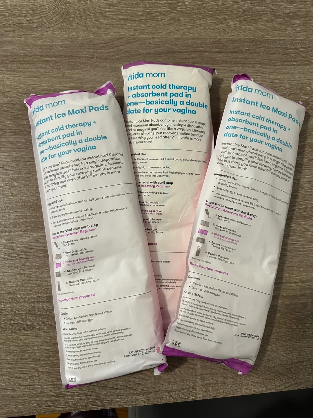 - 3 Frida Mom Instant Cold Therapy + absorbent pad for postpartum recovery. Combines instant cold therapy and maximum absorbency in a single disposable pad. Contains Calcium Ammonium Nitrate and Water, with less than 28% nitrogen.