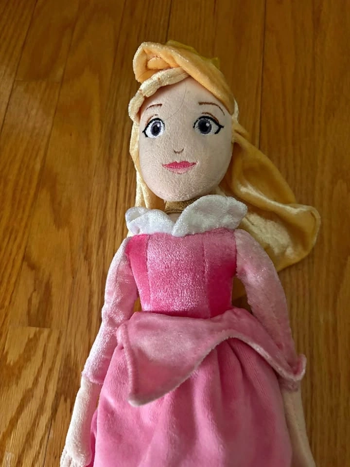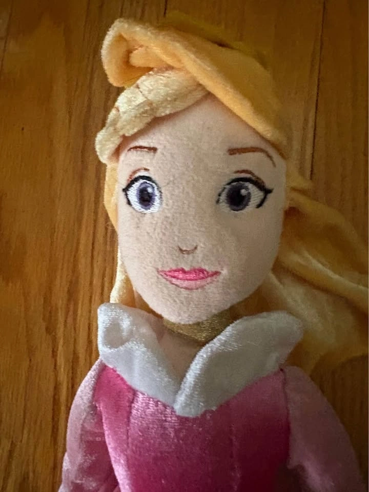 Soft Disney Princess Aurora plush doll with a pink dress and blonde hair. Great for any Disney fan.