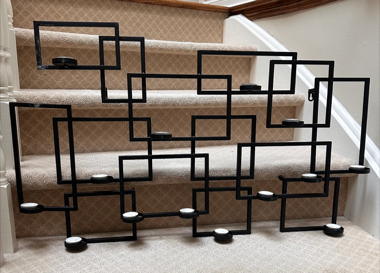Black metal candle holder. A geometric design with multiple square and rectangular shapes. Several round holders suitable for candles. Such a lovely piece to include in your home, creating a peaceful ambience.