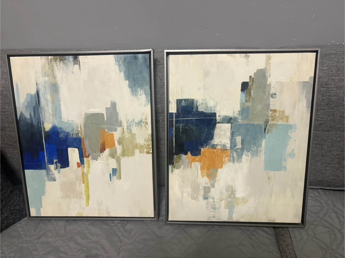 Selling a set of two abstract wall art pieces. They feature a mix of blue, gray, and orange tones. These framed pieces would look great in any living room or office space!