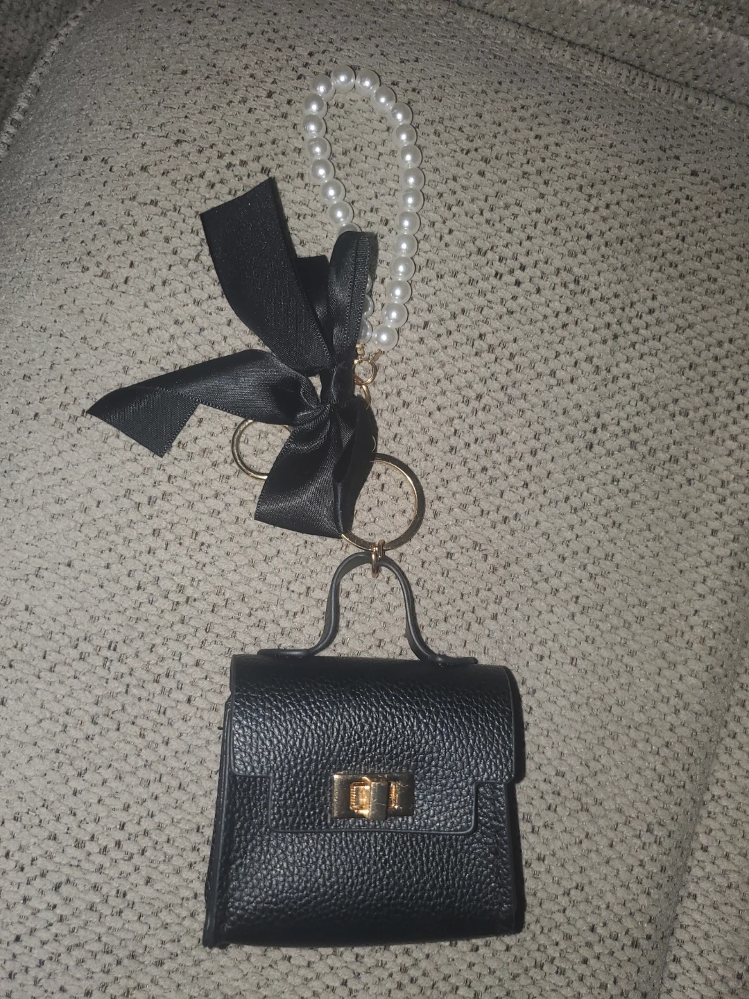 It's a cute mini handbag keychain with a pearl wrist strap and a black satin ribbon bow. The handbag is black with a gold clasp closure. It's a fun accessory for your keys or bag!