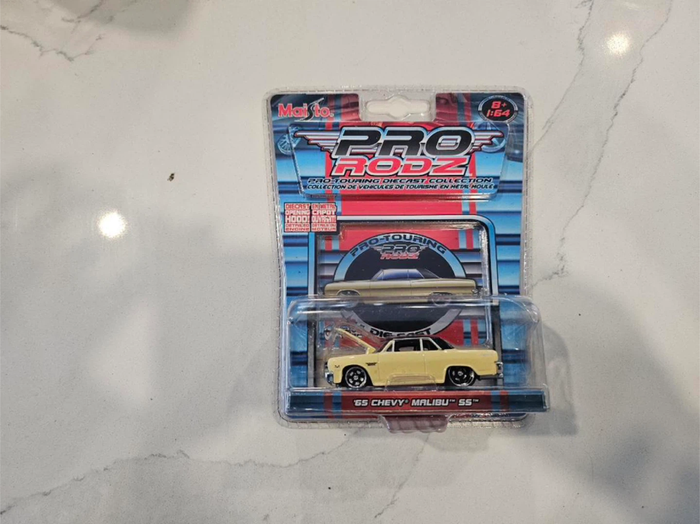 This is a Maisto Pro Rodz diecast model of a '65 Chevy Malibu SS. It's a 1:64 scale vehicle with an opening hood. This diecast car is great for collectors or kids aged 8 and up!