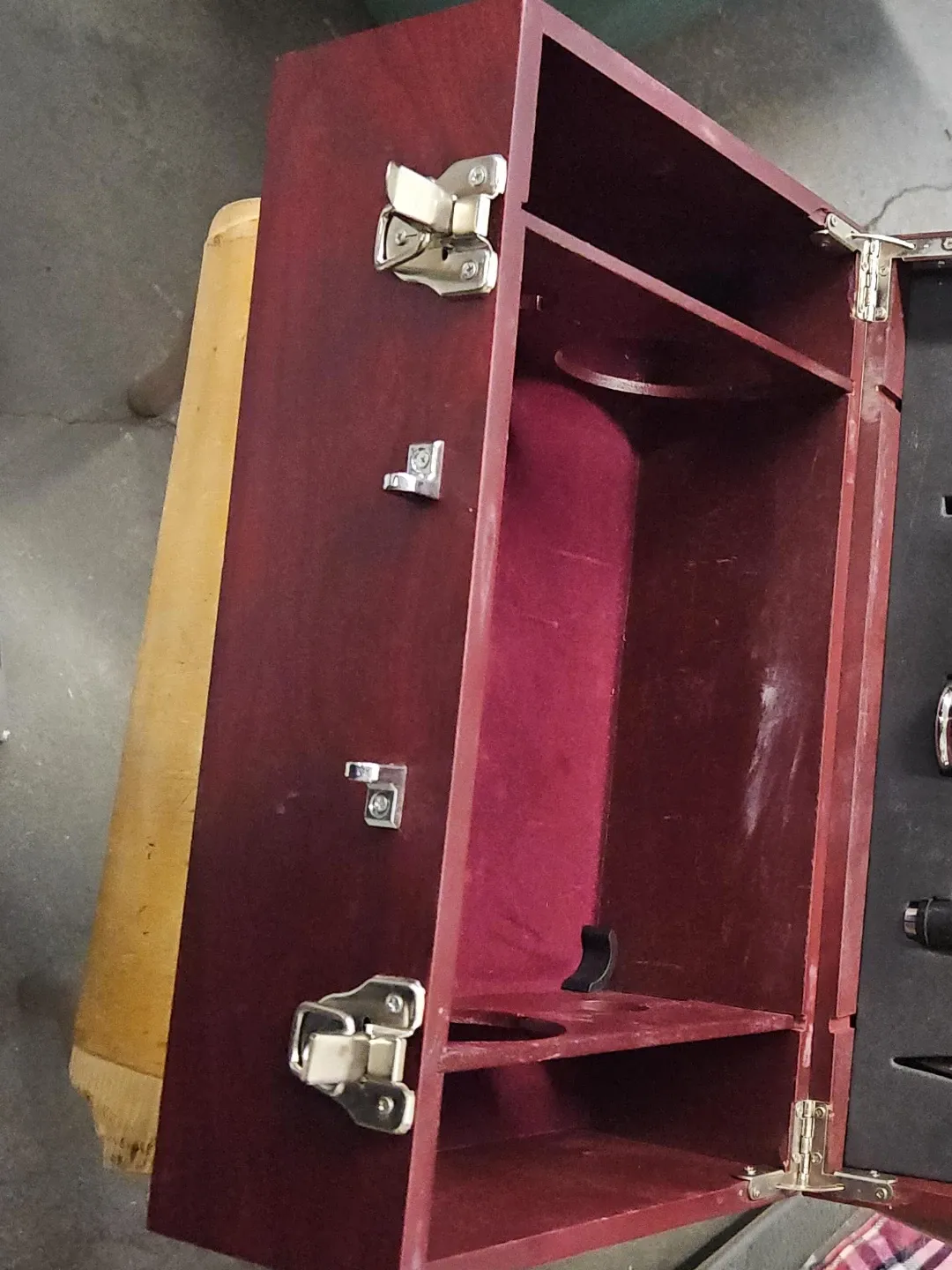 A burgundy wooden display case with metal latches and hinges. It features multiple shelves and compartments, perfect for storing and showcasing small items. The interior is lined with a soft red fabric.