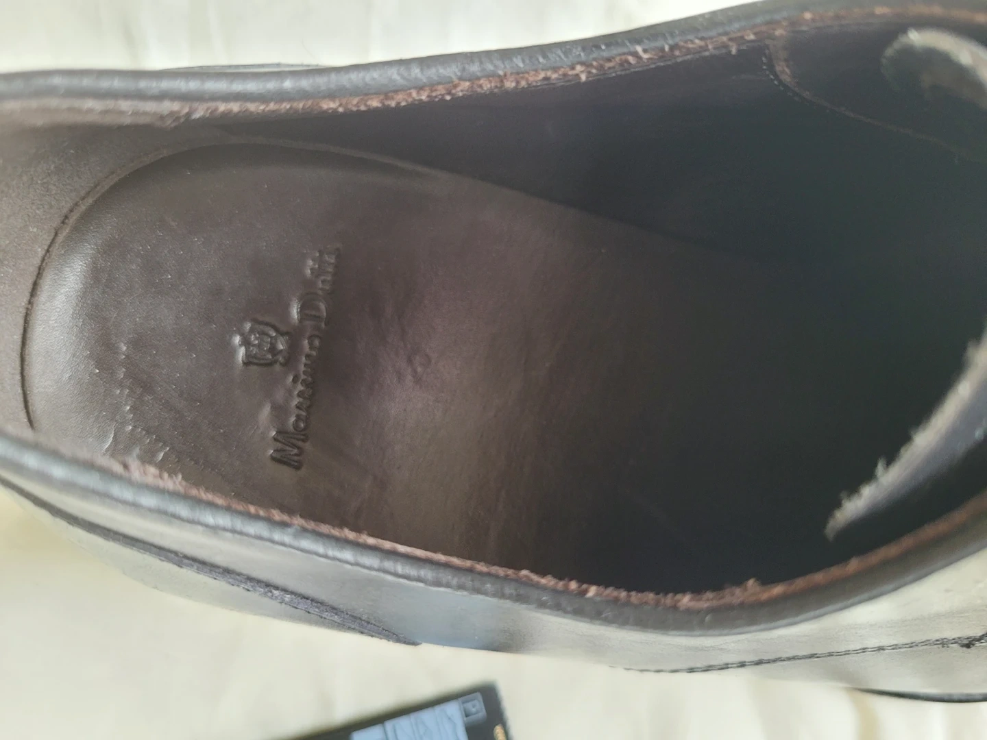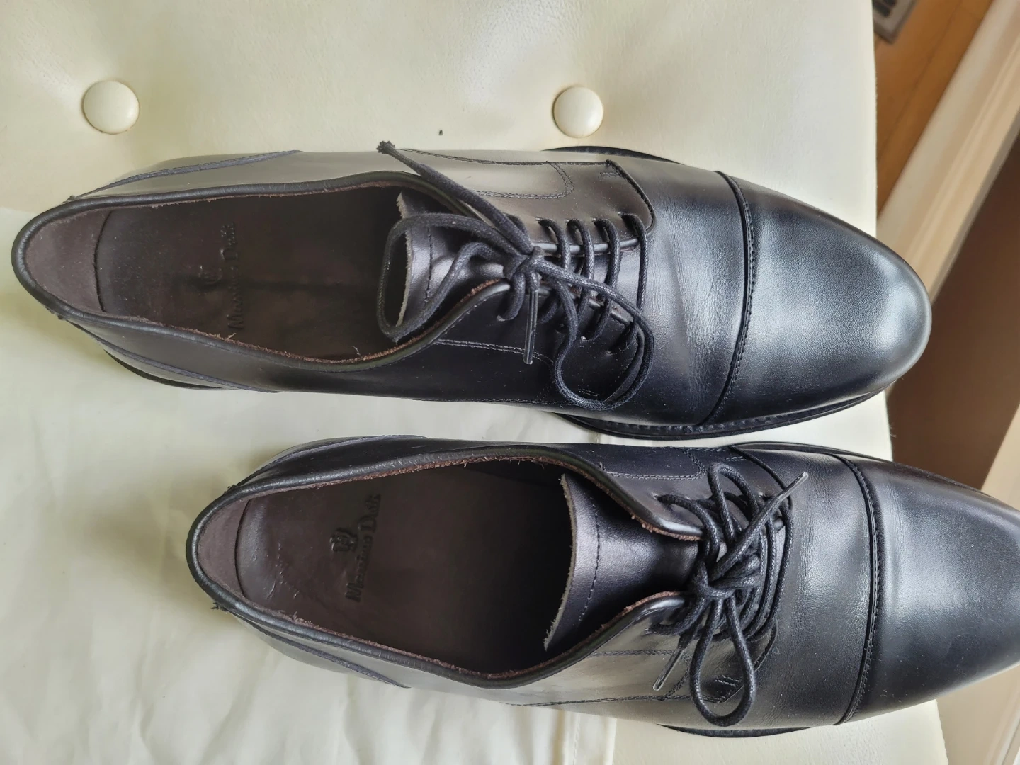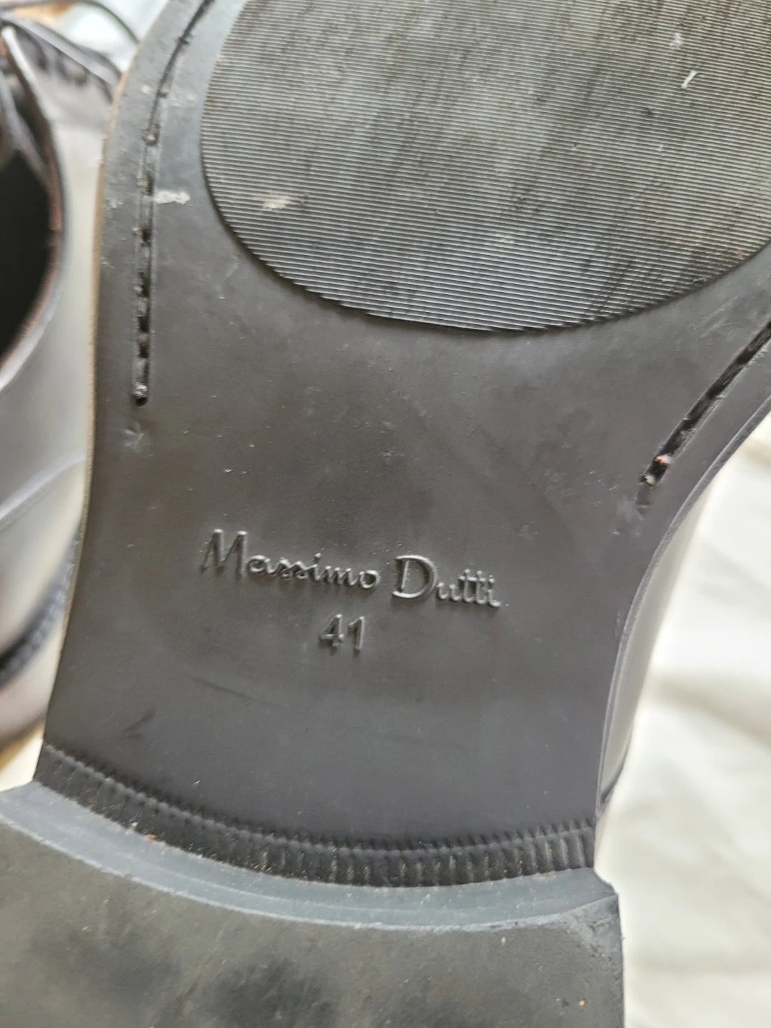 These are classic black leather cap toe Oxford dress shoes from Massimo Dutti. They are a size 41 EU, which is equivalent to a US size 8. Leather material and made in Europe.