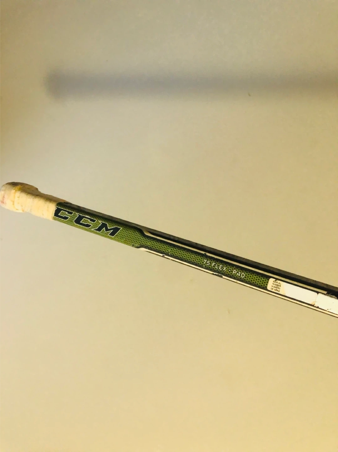 This CCM hockey stick is taped at the blade and handle. It features a 75 Flex P40 curve. It's ready for the rink!