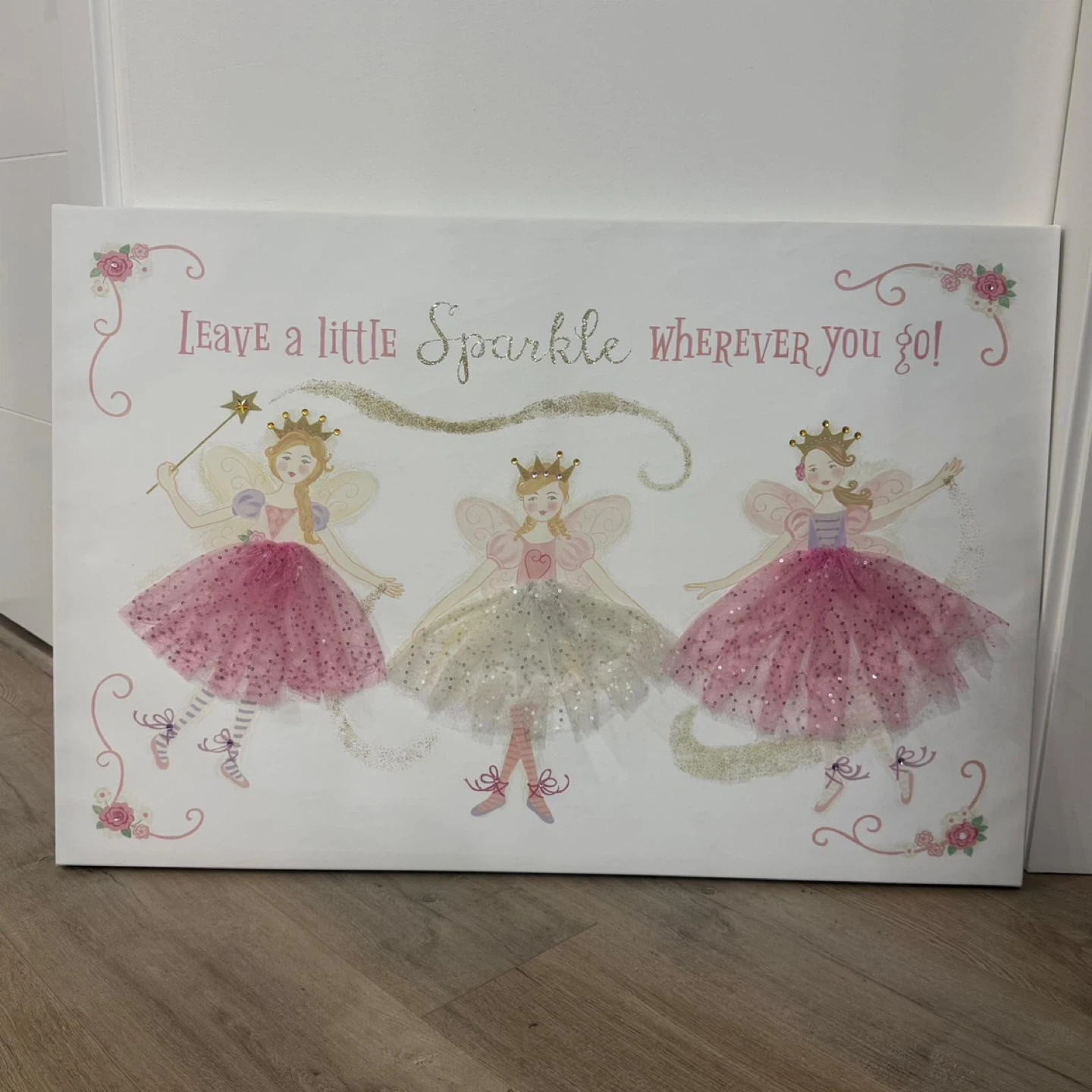 Canvas wall art featuring three fairies with glittery tutus and the text "Leave a little Sparkle wherever you go!". It's a sweet addition to a child's room. Perfect for adding a touch of magic and whimsy!