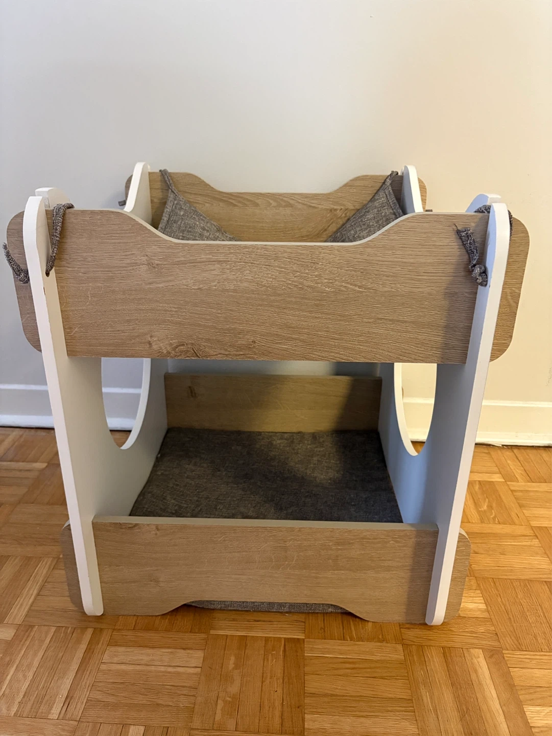 This stylish cat condo offers two levels of comfort for your feline friend. It's constructed with white and wood-grain finished panels, complete with grey fabric cushions. The open design allows for easy access and ventilation.