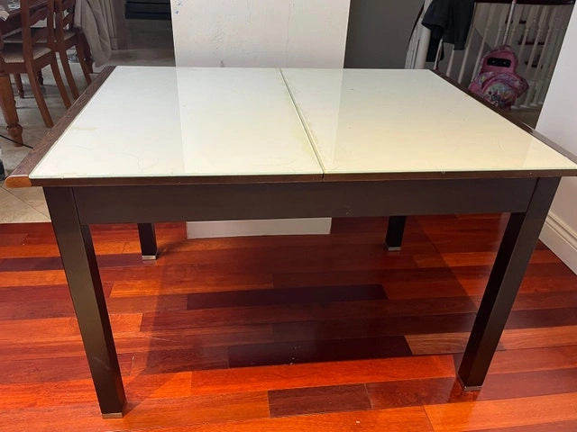 This glass top table is a stylish and functional addition to any dining space, featuring a sleek design with dimensions of 36 inches in both width and length. While it's in used condition, it remains sturdy and perfect for everyday use. Dimensions: 36 inches (width) x 36 inches (length). Material: Glass top with a dark wood frame. Condition: Used - Good. Cash accepted.