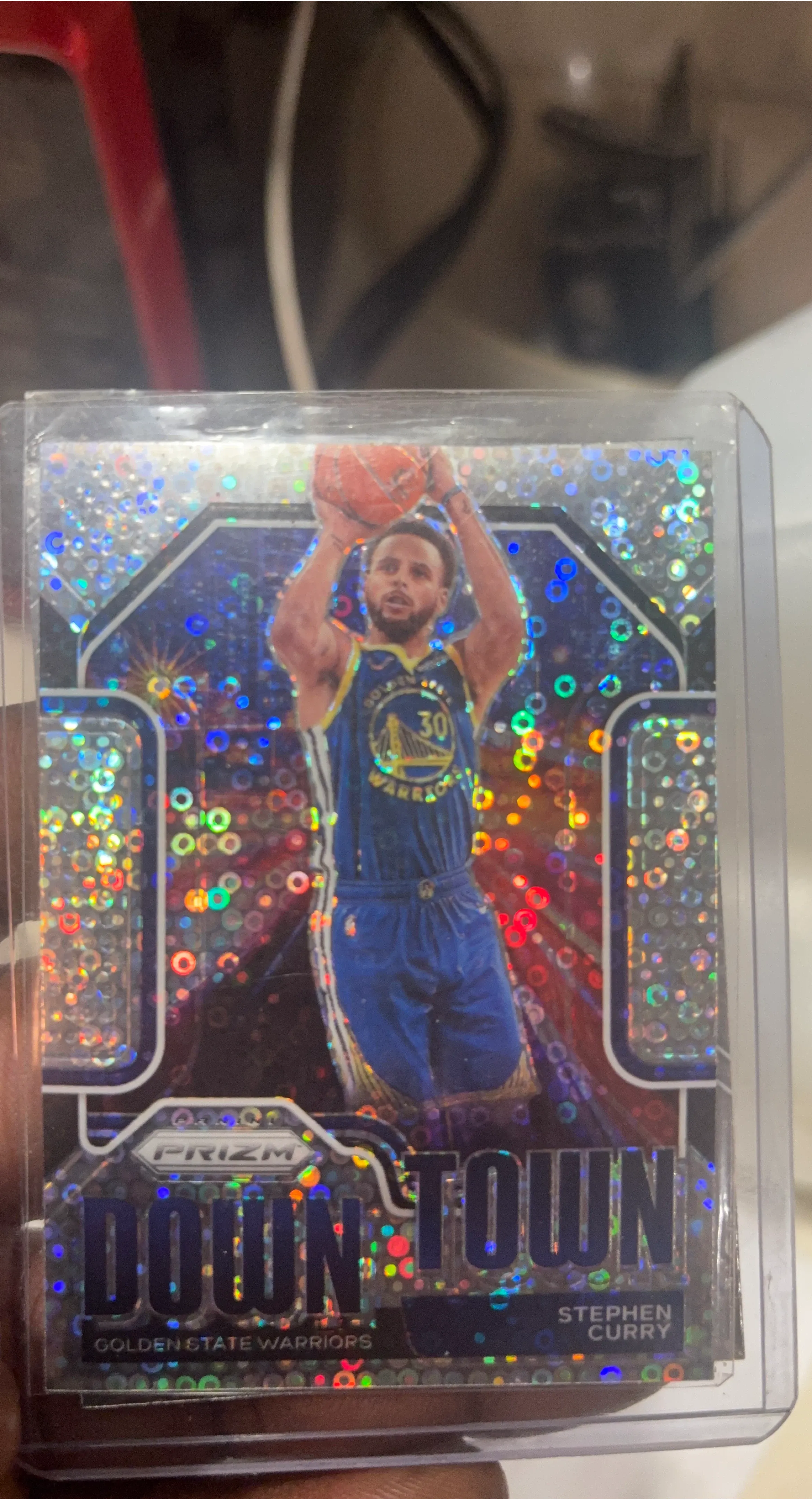 This is a Panini Prizm Downtown trading card featuring Stephen Curry of the Golden State Warriors. It's a collectible item for basketball fans. The card has a holographic design.