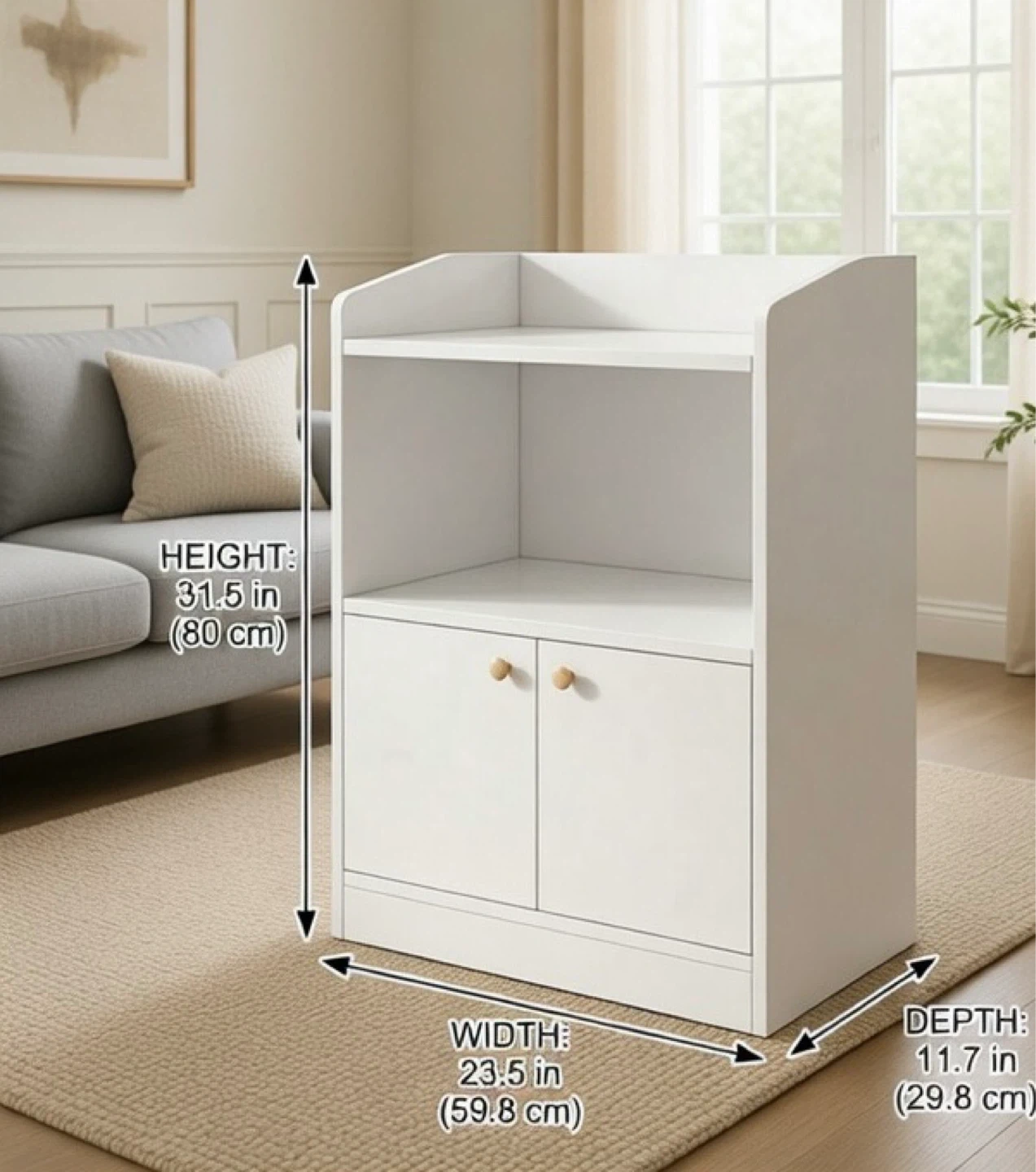 two-door storage cabinet. Height is 31.5 in (80 cm), width is 23.5 in (59.8 cm), and depth is 11.7 in (29.8 cm). Features two open shelves above a cabinet with two doors.