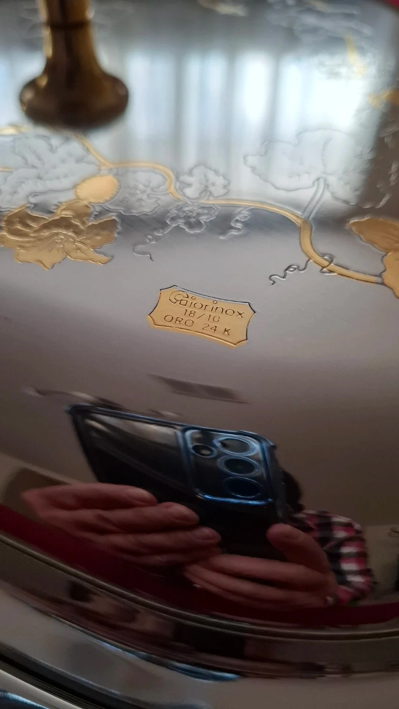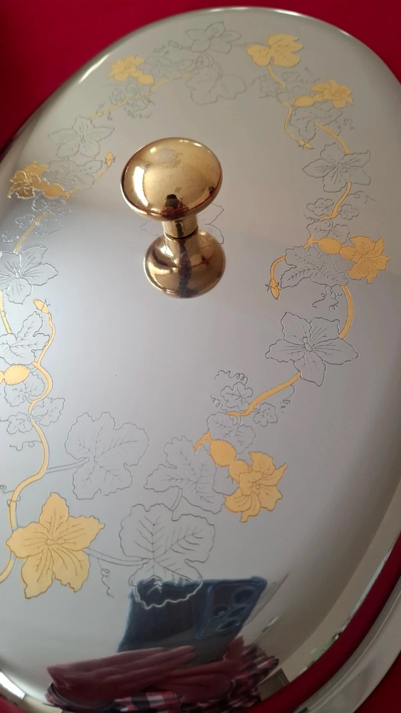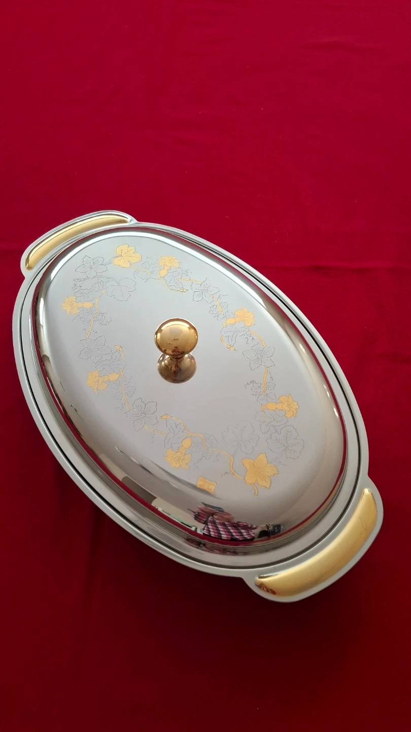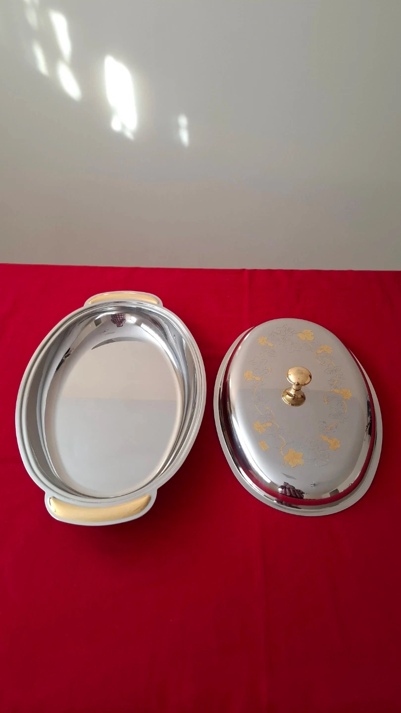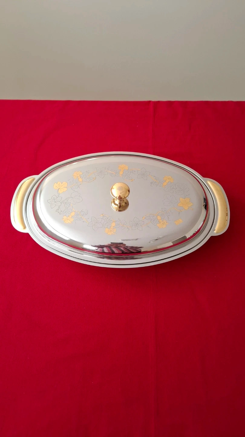 Italian Giorinox 18/10 stainless steel oval serving dish with lid. Features 24 kt gold-plated accents on the handles and delicate floral design on the lid. Includes original certificate guarantee. Elegant vintage Italian tableware. 17"x11"
