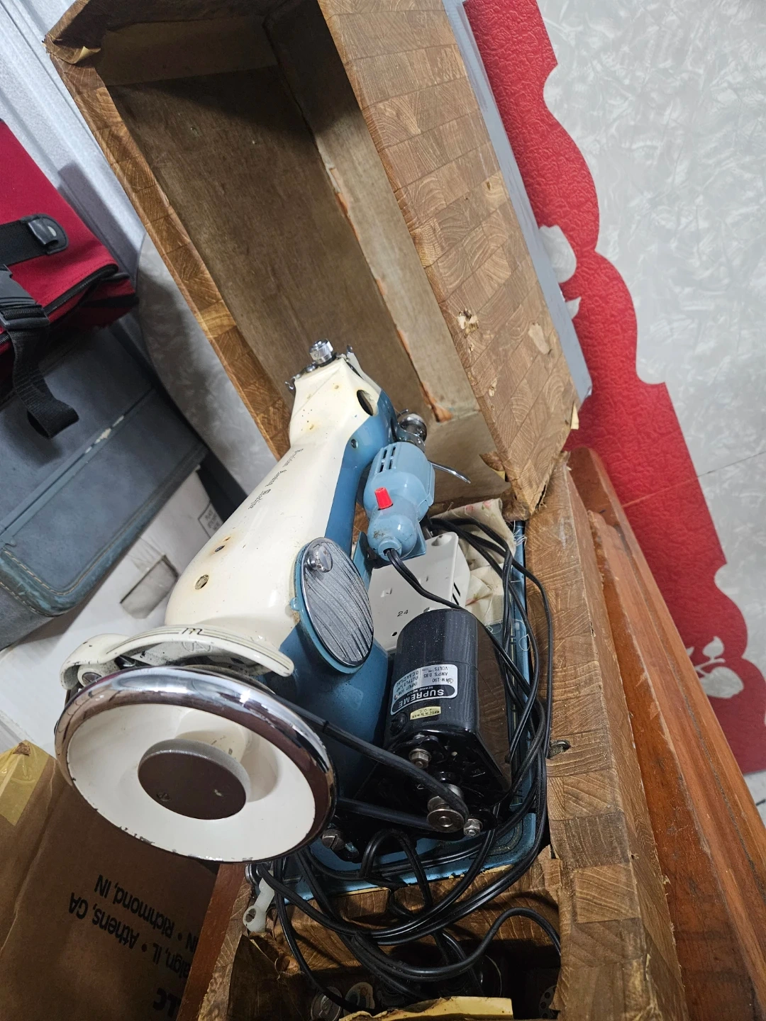 This is a vintage Precision sewing machine. It includes its original wooden case. The machine has a cream and blue color scheme. It's a classic piece for any sewing enthusiast!