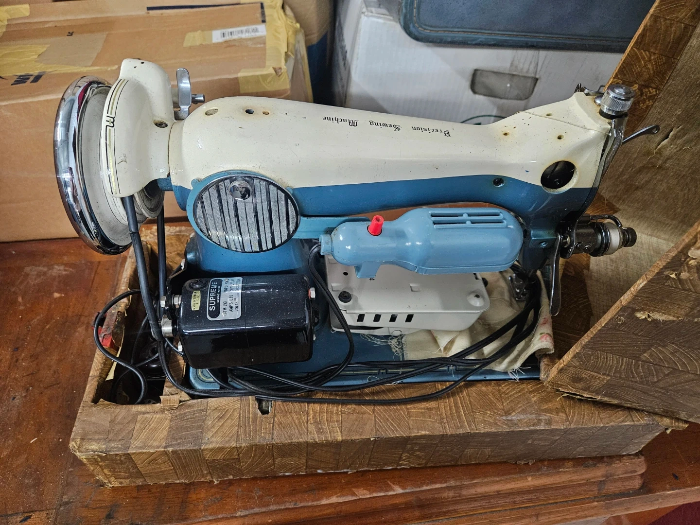 This is a vintage Precision sewing machine. It includes its original wooden case. The machine has a cream and blue color scheme. It's a classic piece for any sewing enthusiast!