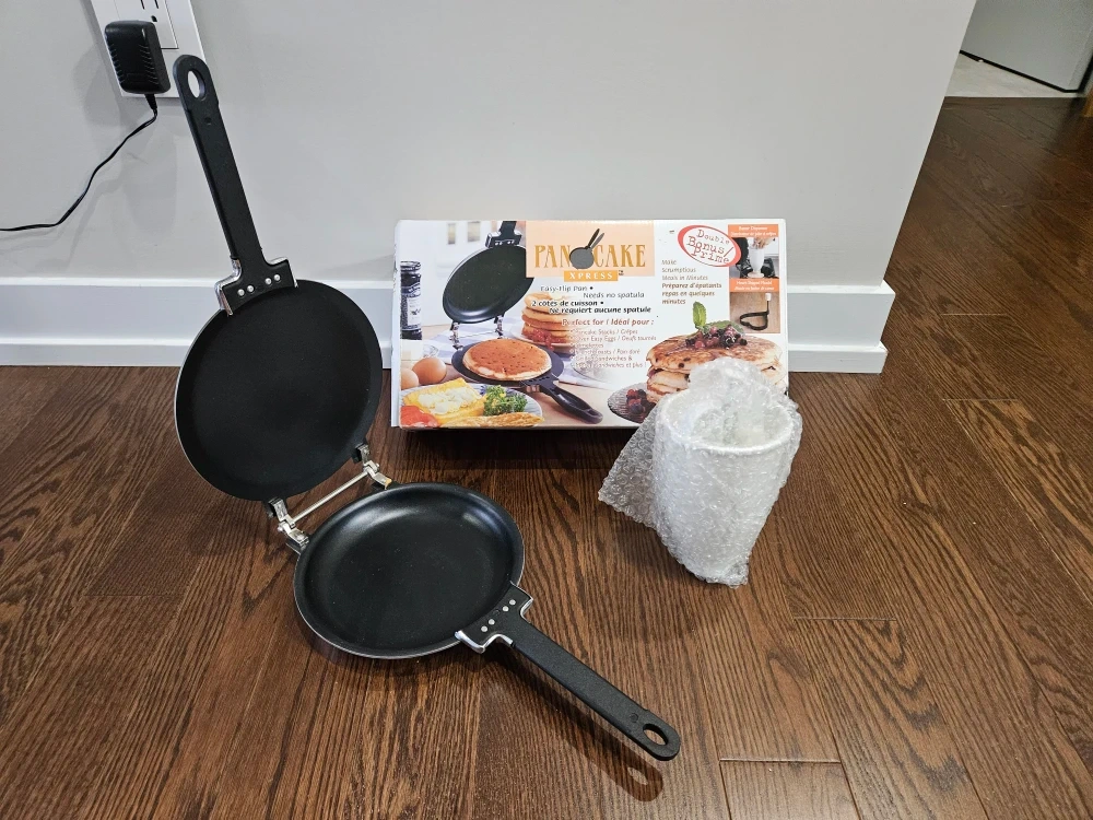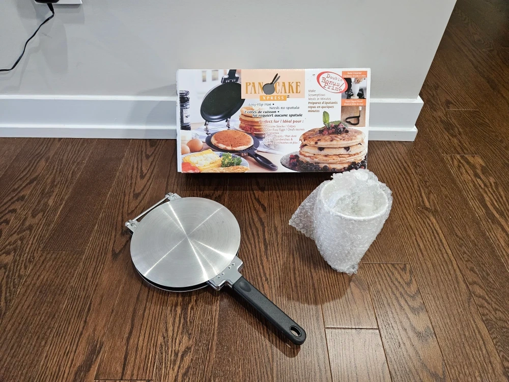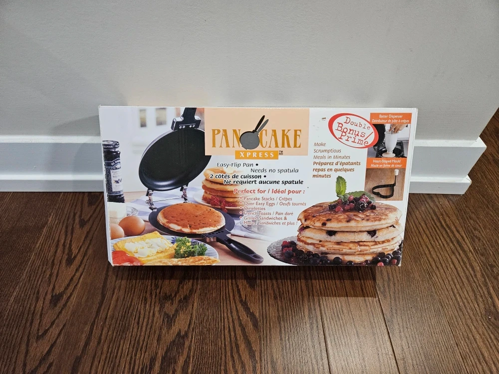 This Pancake Xpress makes easy-flip pancakes and needs no spatula. It's great for making pancakes, crepes, French toasts, and eggs quickly. Included is the pancake maker and a batter dispenser cup.
