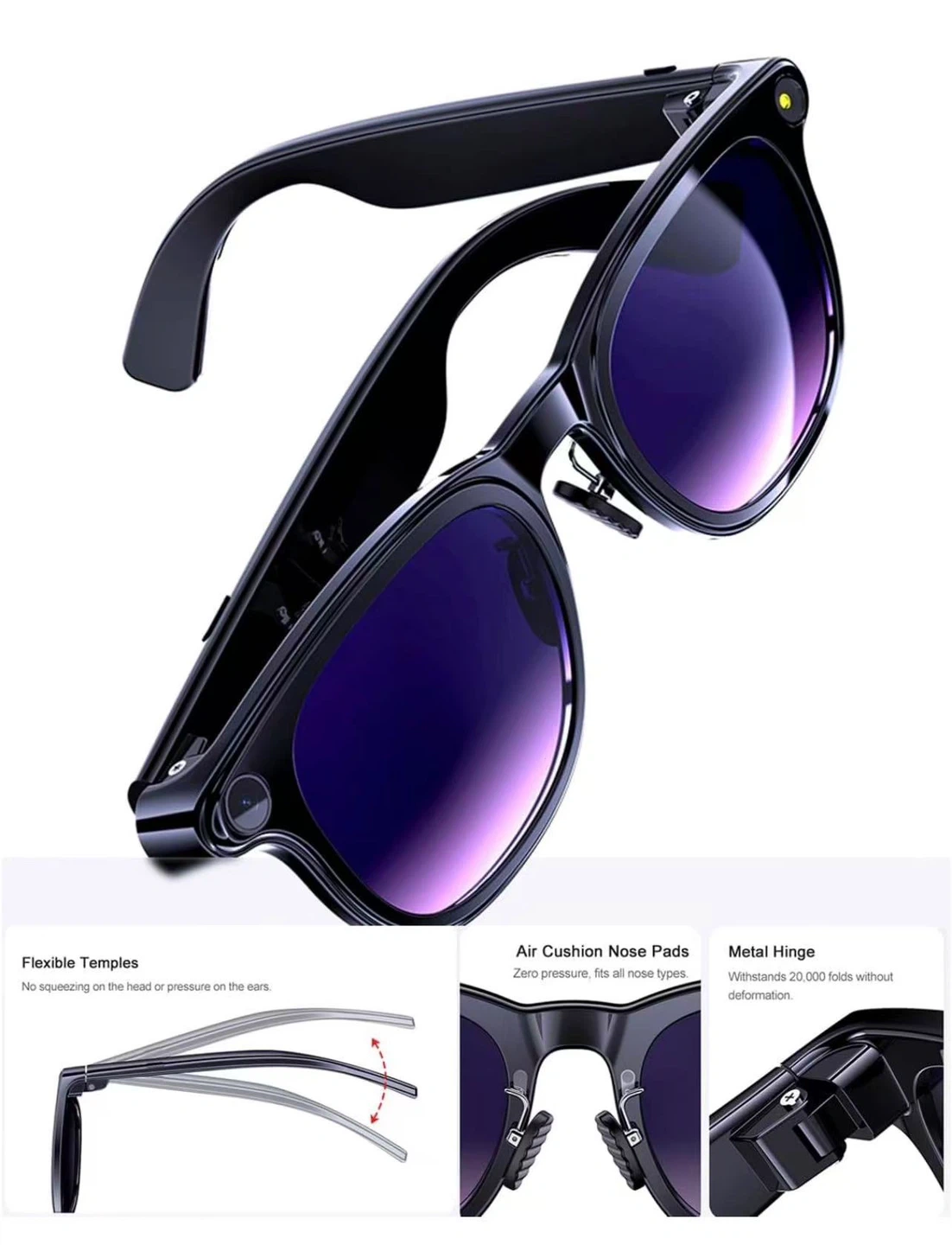 AI Smart Glasses with Camera, 8MP HD Bluetooth Camera Glasses, 1080P Video Recording Sunglasses for Women Men, Real Time Translation, Voice Assistant, Open-Ear Audio for Travel, Work Vlog (3 lenses)