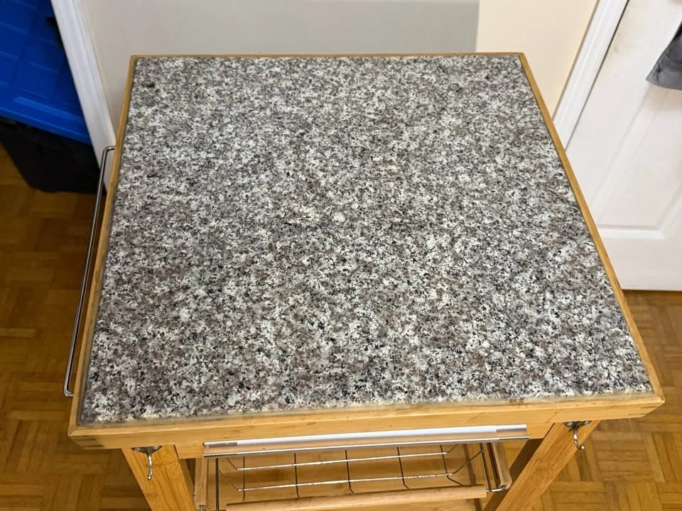 Versatile kitchen cart with a granite top, bamboo frame, a drawer, and a pull-out wire basket. Features a shelf, wine rack, and side hooks. Easy to move with wheels. Local pick up near Steeles and Dufferin. Cash only.