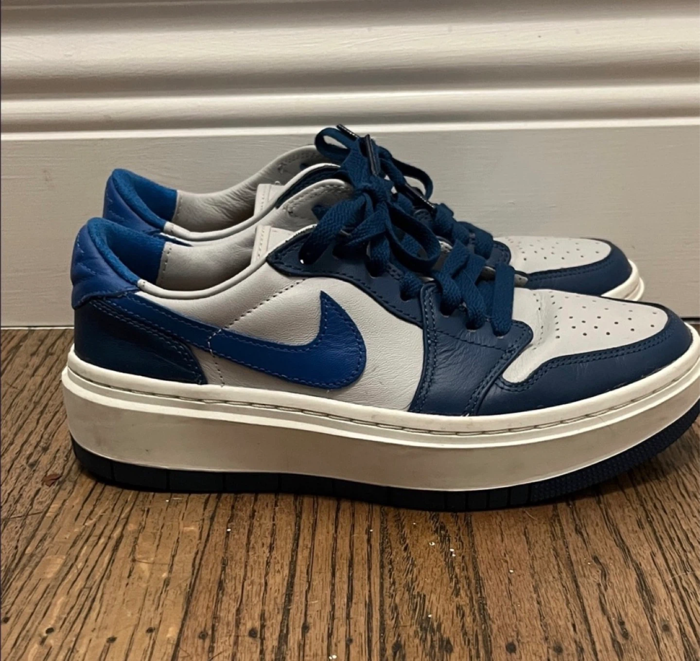 These Air Jordan 1 Low Elevate sneakers come in a stylish blue and grey colourway. The shoe's tag indicates a US size 8 (EUR 39). They're made with leather and feature a platform sole.