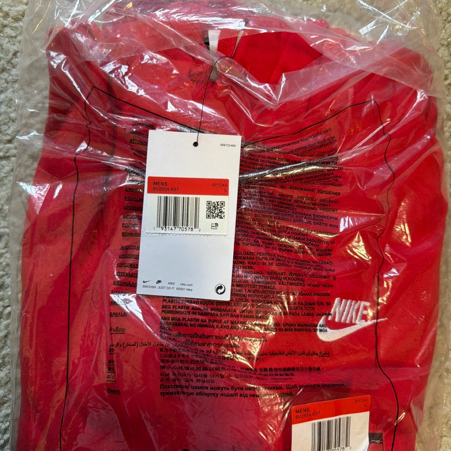 This is a red Nike pullover hoodie. It's a men's size small. Features a front pouch pocket and a drawstring hood.