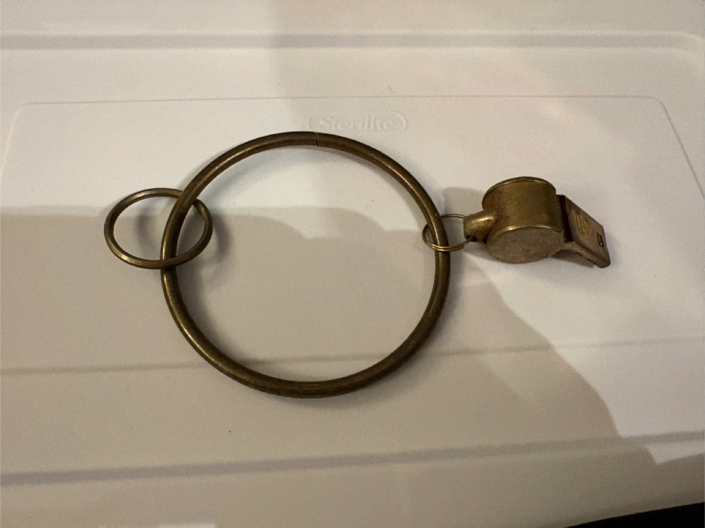 Unique vintage brass-tone key holder bracelet featuring a built-in whistle and key ring. Designed to slip over the wrist so keys are easy to carry and access.