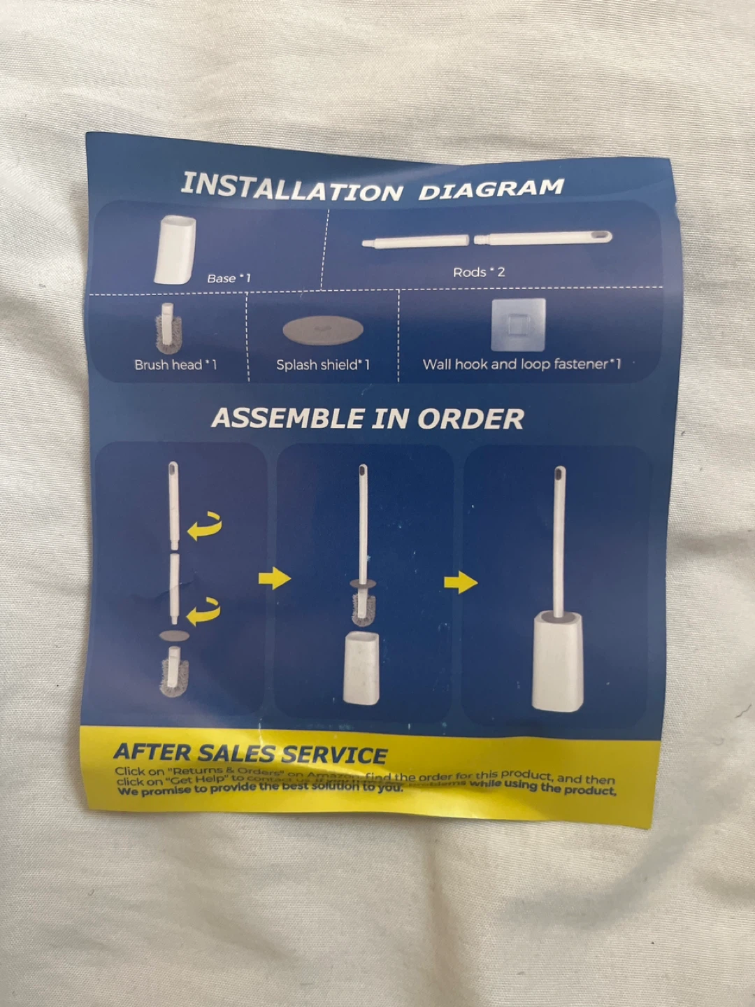 Toilet brush with holder. Includes base, splash shield, and wall hook. Fine bristles make it easy to clean. Features base storage.