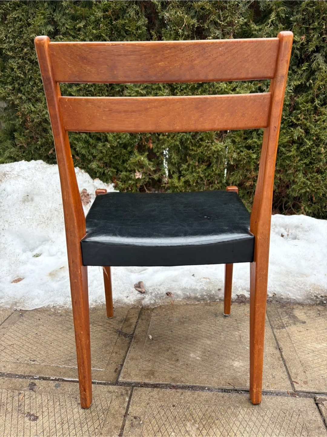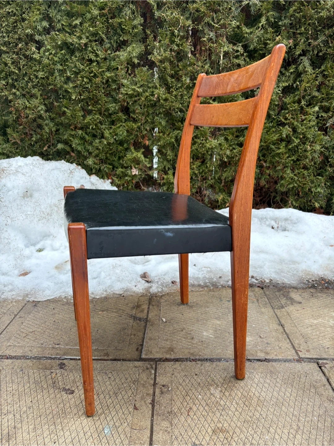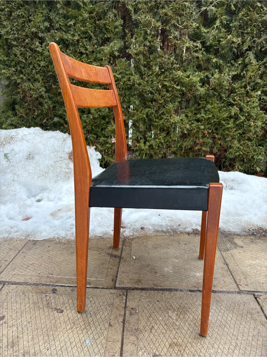 Set of Mid-Century Modern teak dining chairs by Svegards, Sweden. Clean Scandinavian design with solid teak frames, ladder backs, and black upholstered seats.