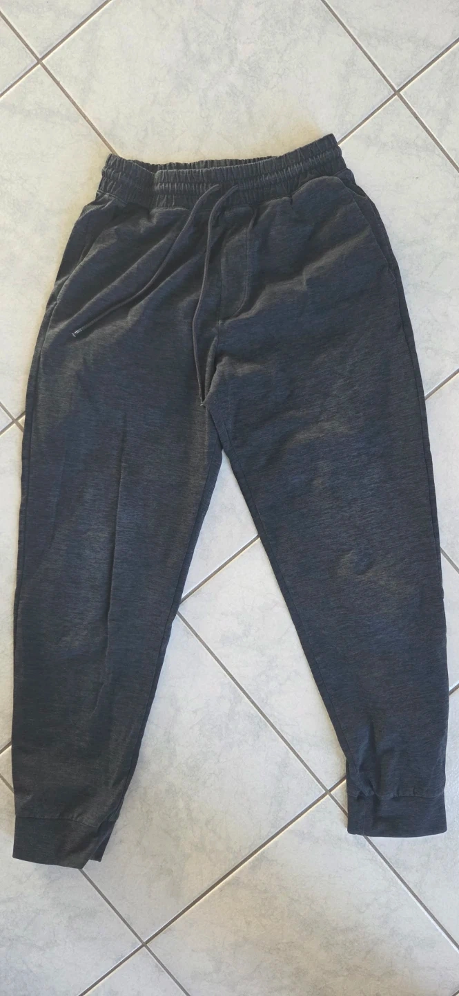 3 pairs of Uniqlo sweatpants in a grey melange colour. These joggers have an elastic waistband with a drawstring. Made from a polyester blend fabric. Perfect for casual wear or lounging!