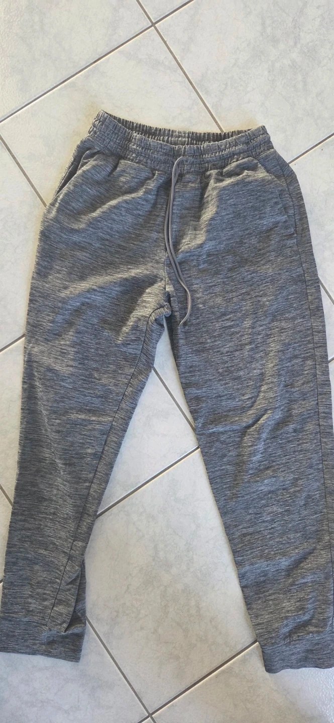 3 pairs of Uniqlo sweatpants in a grey melange colour. These joggers have an elastic waistband with a drawstring. Made from a polyester blend fabric. Perfect for casual wear or lounging!