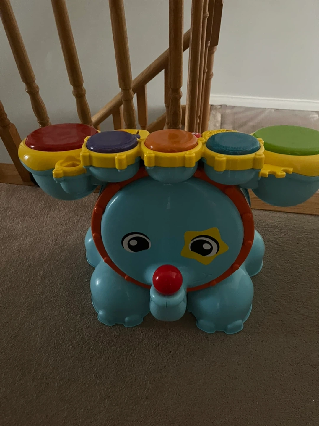 This is a blue elephant-shaped toy drum set. It has colourful drum heads and a red nose. Made of plastic. AHas to replace battery