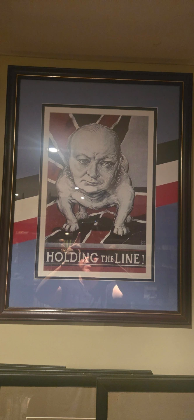 This is a framed print titled "Holding the Line!". It features a depiction of Winston Churchill as a bulldog against the Union Jack. A unique piece for any history enthusiast!