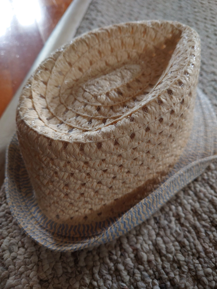 Lightweight straw boater hat. Features a light beige colour and a blue patterned brim. Excellent for summer. Should fit around 1-3 years old .