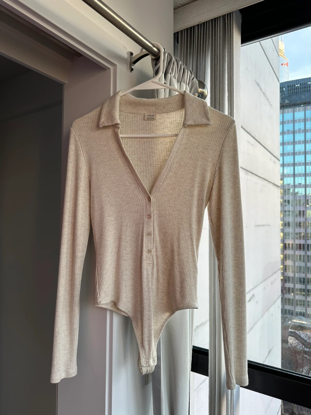 A Wilfred ribbed long sleeve bodysuit in a cream colour. It's made in Vietnam. This piece features a collared neckline with a button-up detail. Size small
