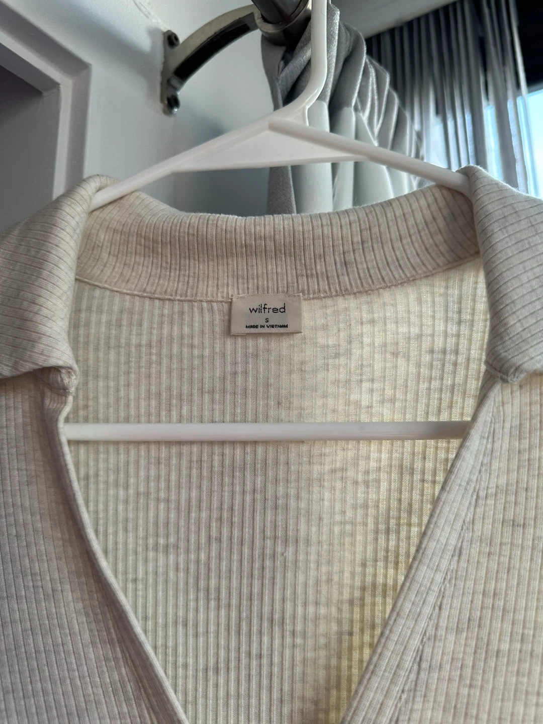 A Wilfred ribbed long sleeve bodysuit in a cream colour. It's made in Vietnam. This piece features a collared neckline with a button-up detail. Size small