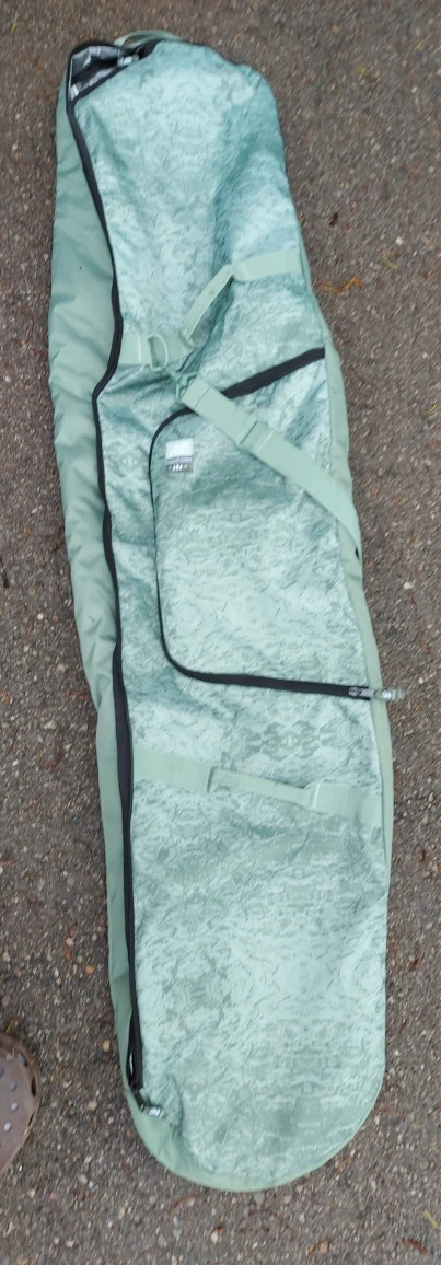 Burton snowboard ready for the slopes! It comes with bright orange bindings for a secure fit. A light green snowboard bag is included for easy transport and protection.
