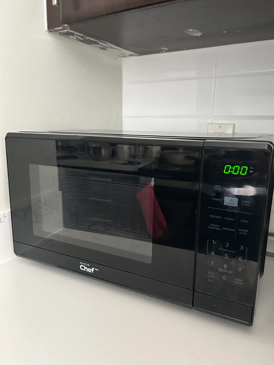 Black Master Chef microwave. It has a digital display and several preset buttons for common foods like popcorn and pizza.