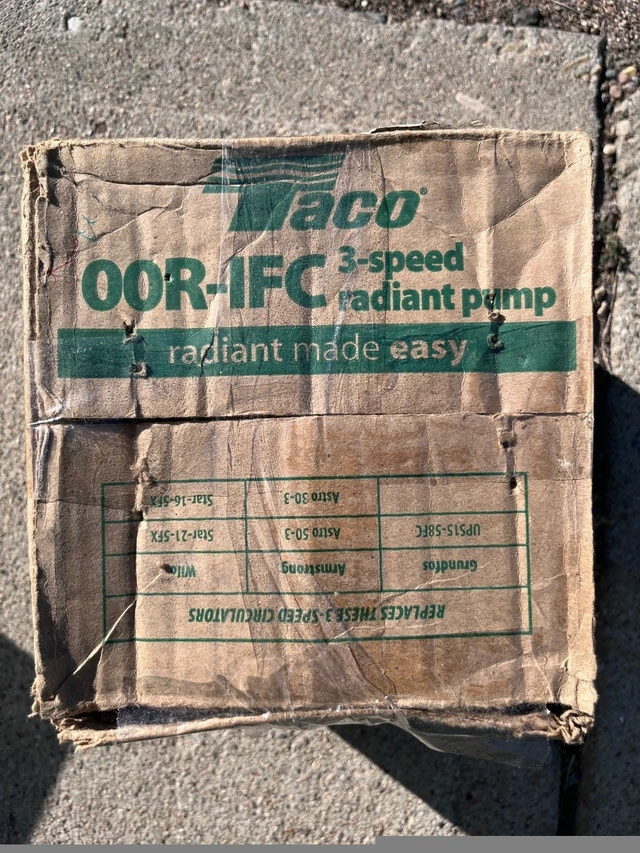 Offering a Taco 00R-MSF1-1IFC Multi-Speed Cartridge Circulator Water Pump, great for hydronic heating. This pump is designed for efficient water circulation in residential and light commercial applications. Two available. Key features include: Multi-speed operation for customized performance, durable construction for long-lasting use, and a compact design for easy installation. Model: 00R-MSF1-1IFC. This is new and unused, though the box has seen better days. Looking at similar items, I estimate the value to be around $150.00 CAD. I've priced it to sell! If the ad is up, it's still available. Cash accepted.