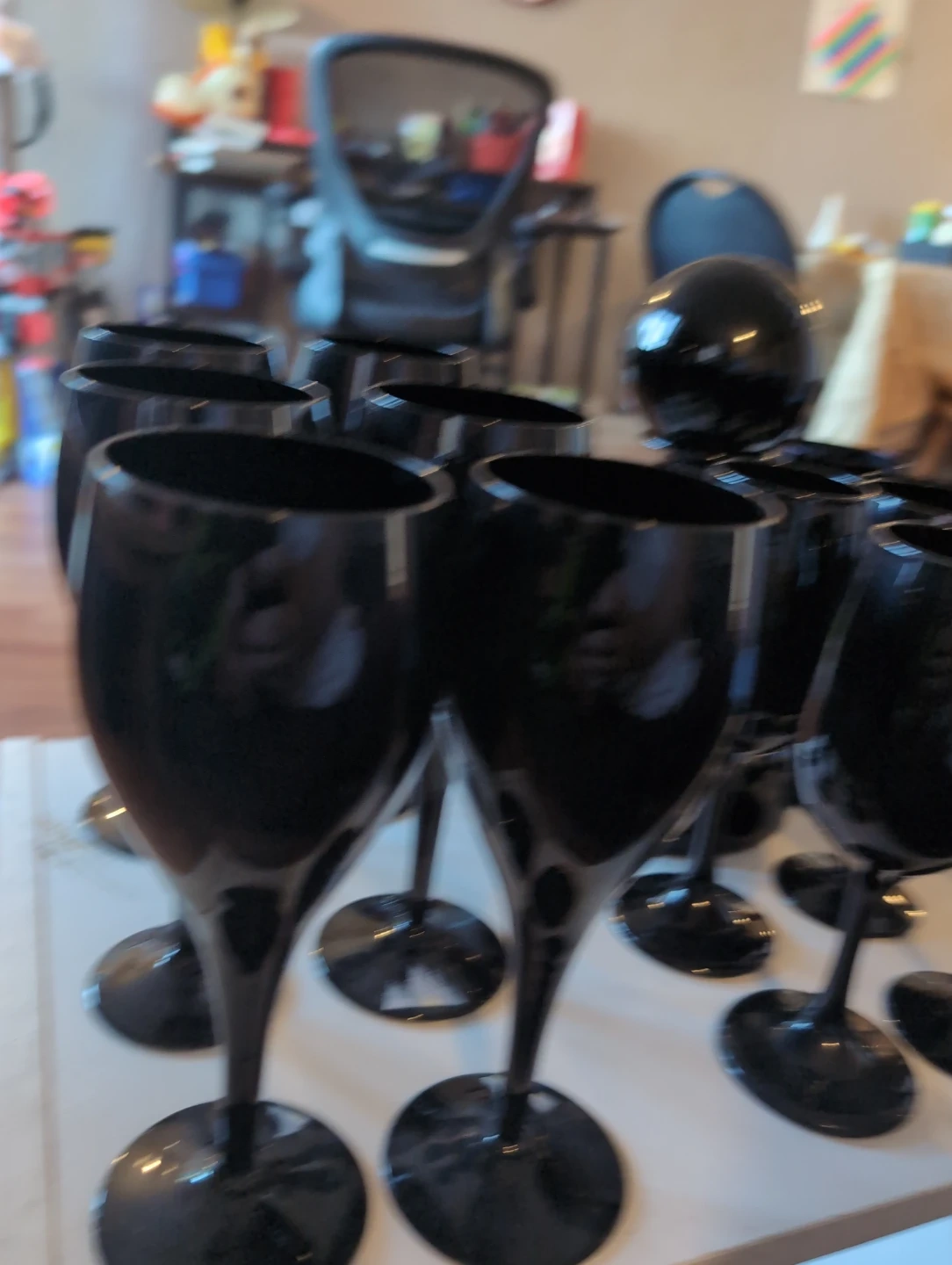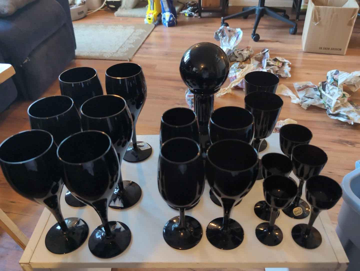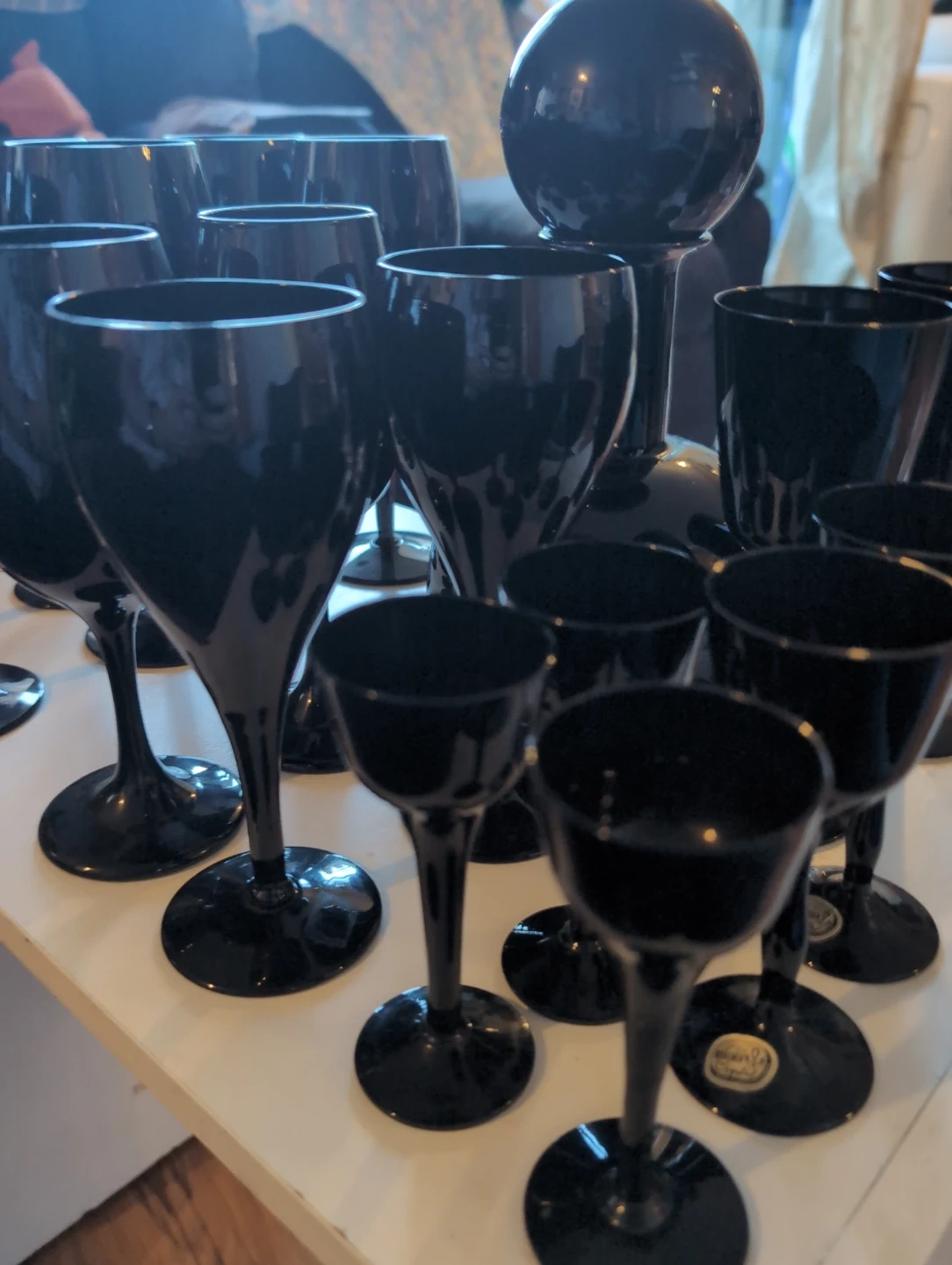 Elegant set of 15 black Bohemia Crystal glasses, made in Czechoslovakia. This collection includes various sizes for different beverages. These would be great for a fancy dinner party!