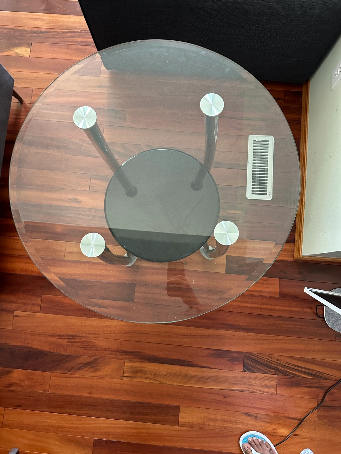 For sale: A charming pair of used round glass tables, each in good condition and ready to enhance any room. The tables feature smooth, clear glass tops that are ideal for displaying decorative items or for use during gatherings. Their sturdy bases provide reliable stability, while the transparent glass design helps to maintain an open, airy feel in your space. Perfect as elegant coffee tables in a living room or as stylish side tables in a bedroom or lounge area.