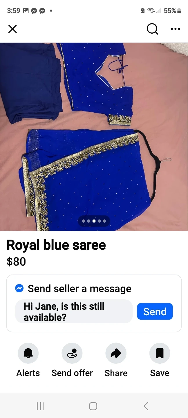 This is a royal blue saree. It's embellished with small silver or clear stones and features a decorative gold border. A matching unstitched blouse piece is included. Perfect for special occasions!