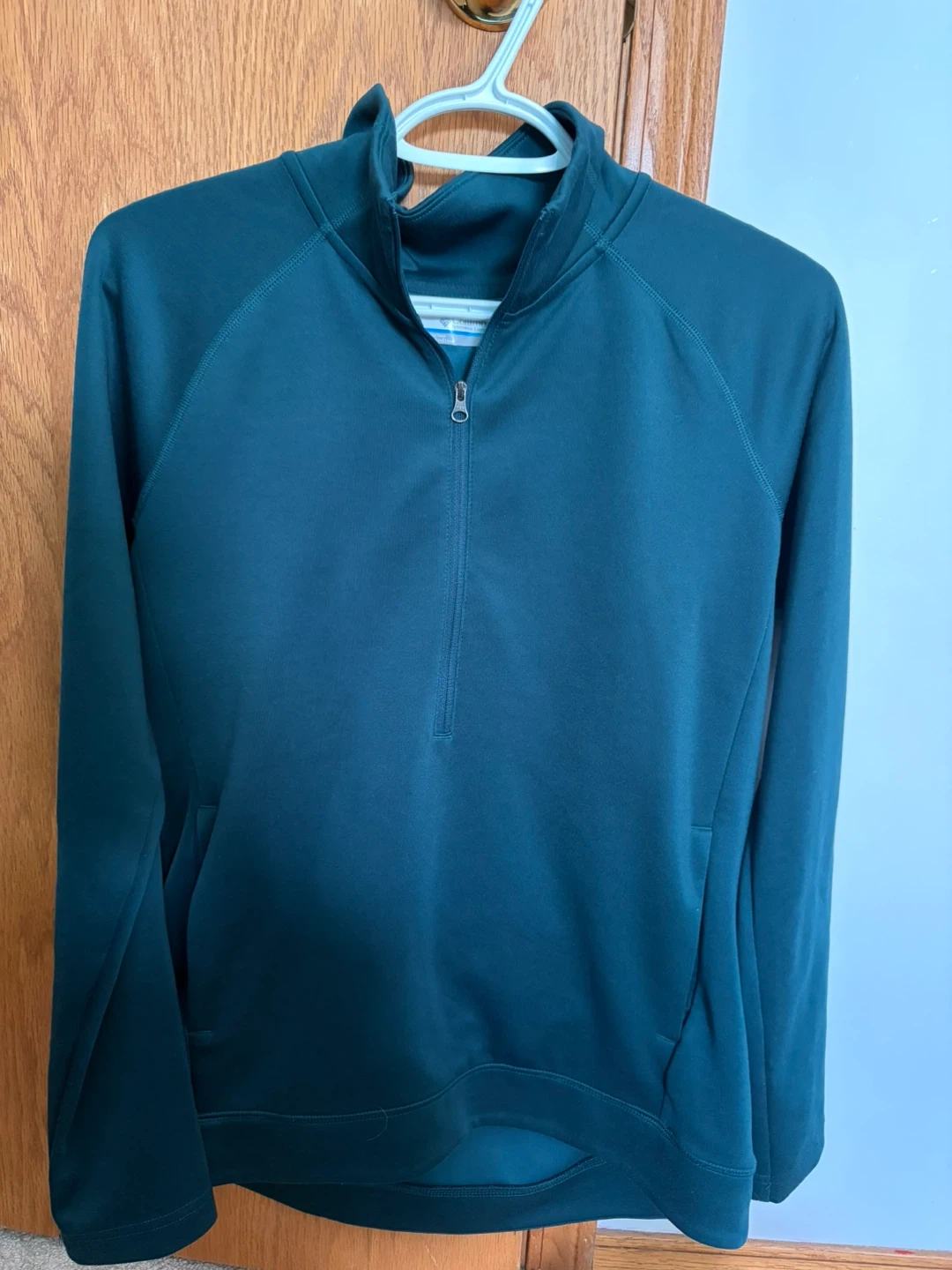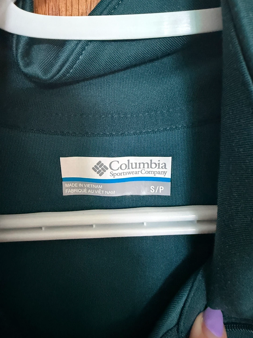 Columbia Sportswear Company pullover jacket. It's a size small but fits larger. This teal-coloured 1/4 zip has pockets. Great for layering!