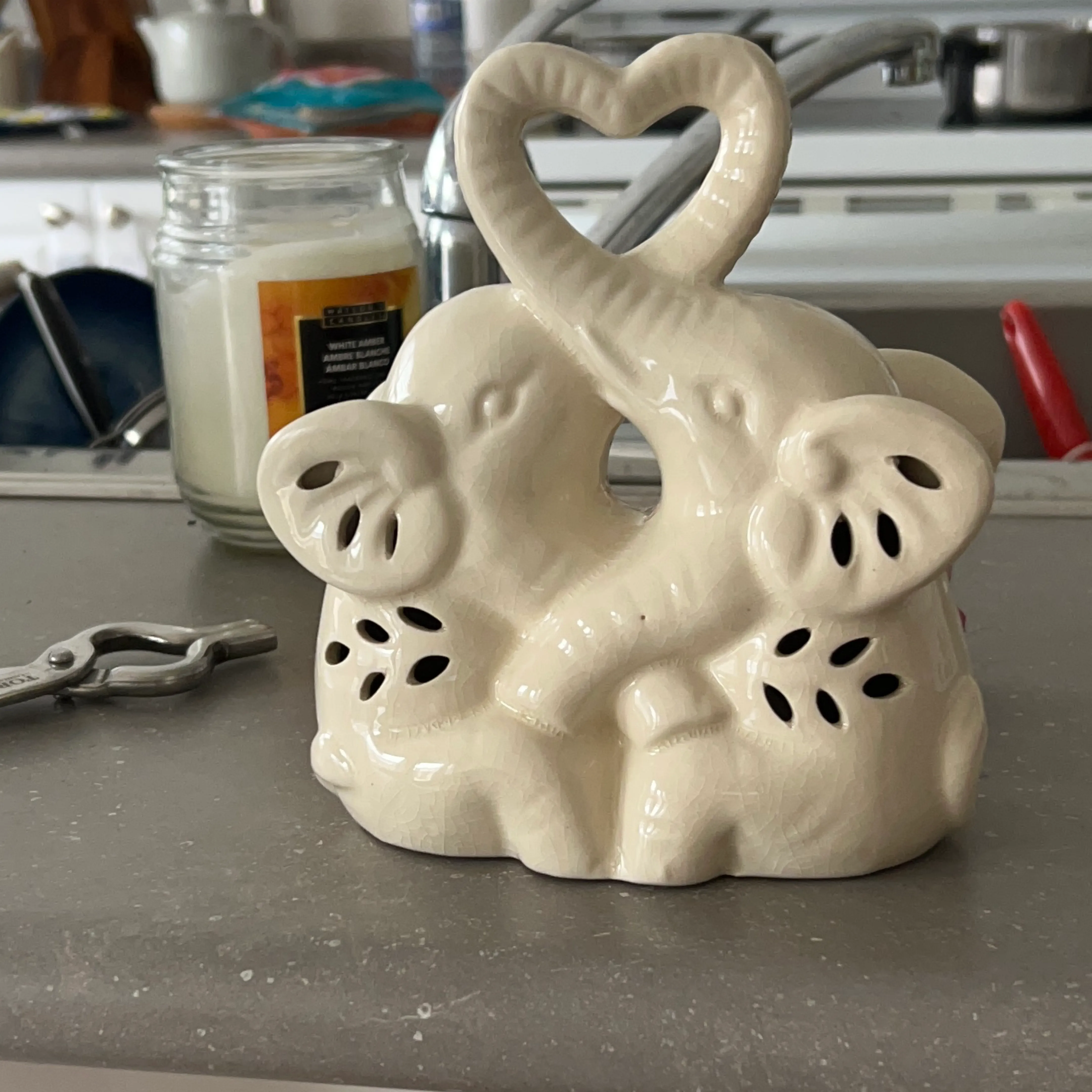 Sweet ceramic figurine featuring two elephants with trunks intertwined, forming a heart shape. It's a creamy off-white colour with cutouts for light to shine through. Makes a lovely decorative piece.
