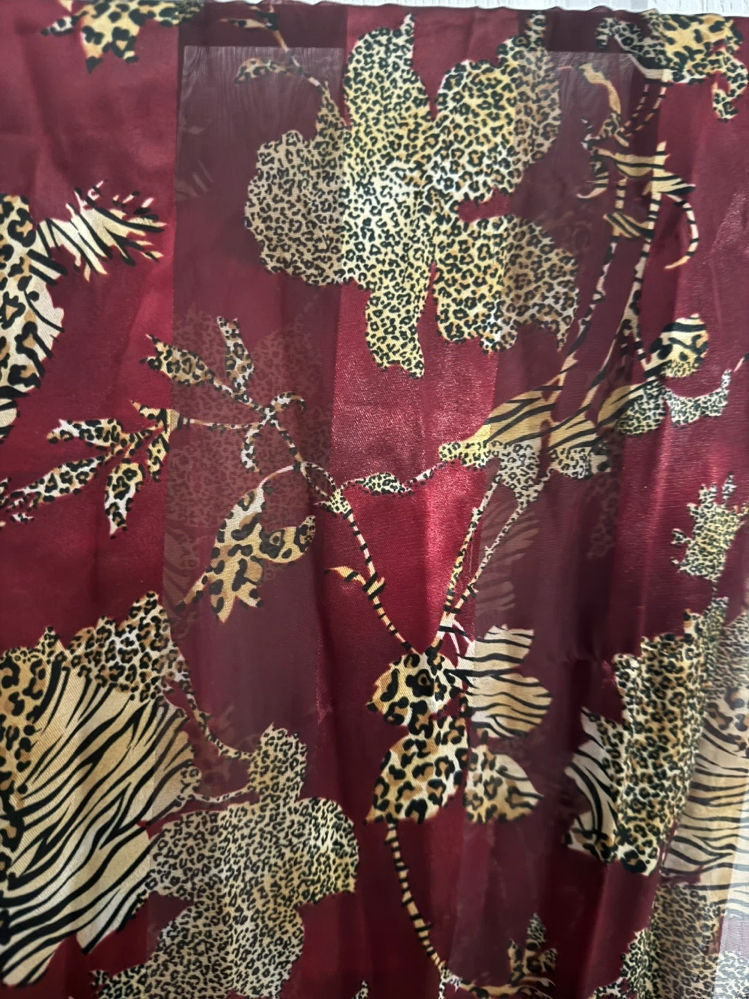 *Like New*. This stunning rich burgundy scarf has sheer & solid vertical panels, featuring a bold animal print.
