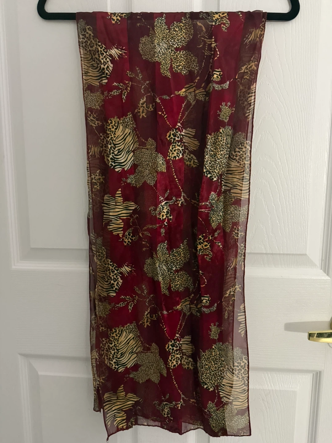 *Like New*. This stunning rich burgundy scarf has sheer & solid vertical panels, featuring a bold animal print.