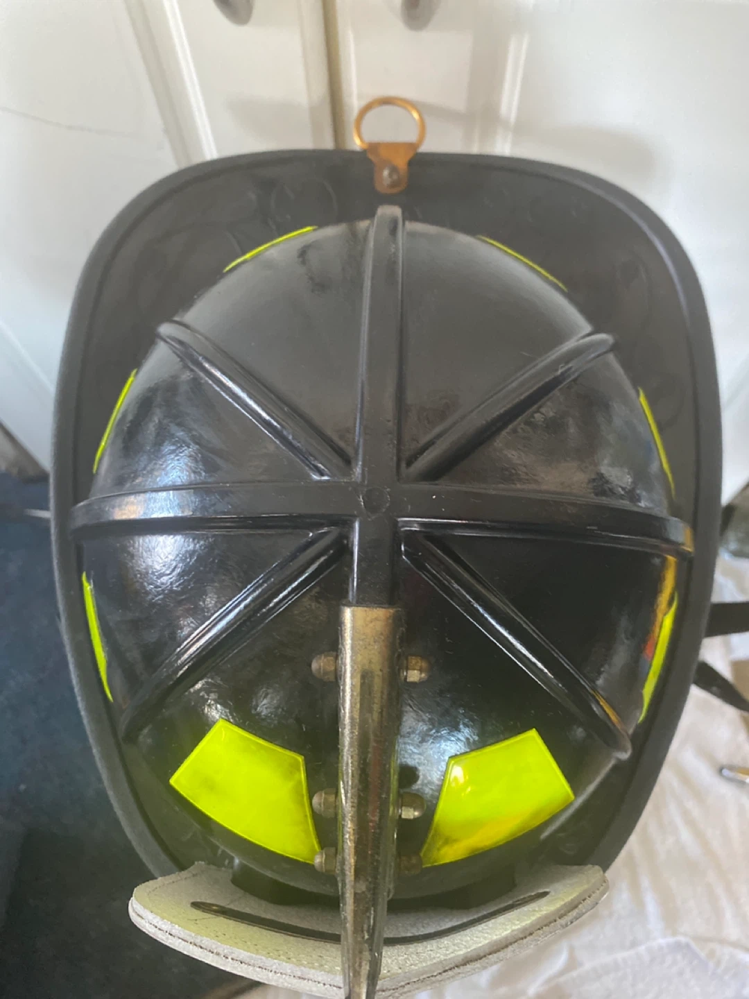 This is a used black firefighter helmet with reflective yellow markers and a shield below a falcon that reads 'FIRE OPS 101 TORONTO'. It comes with black integrated goggles.