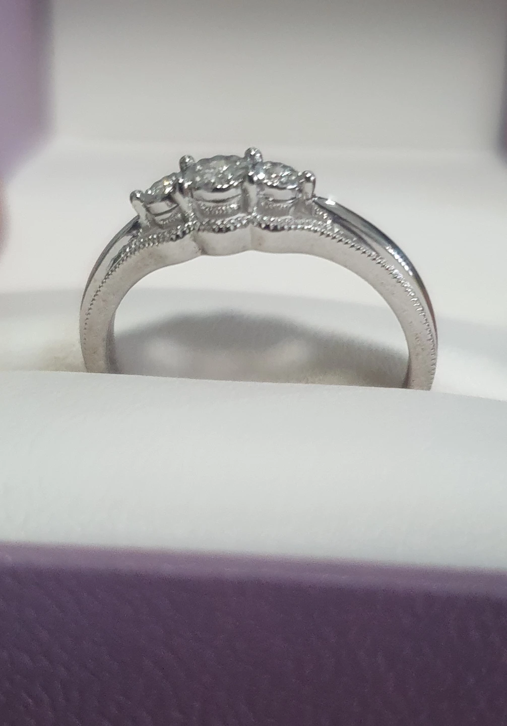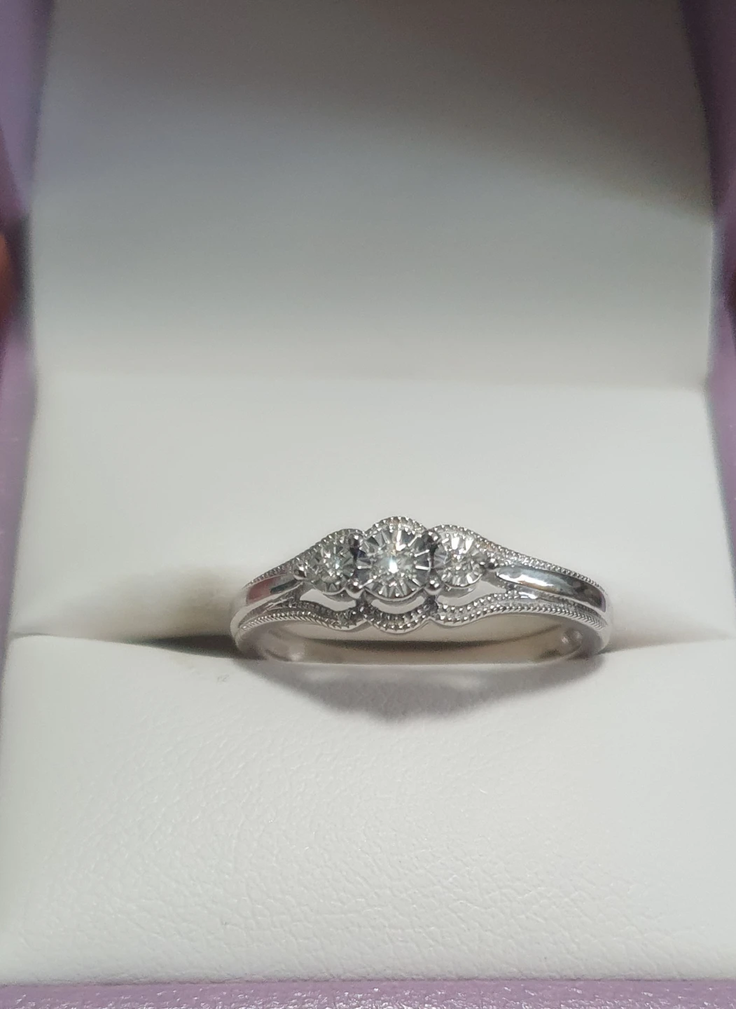 A lovely three-stone diamond ring set in white gold. It features a central diamond flanked by two smaller stones. The band has delicate detailing along the edges.