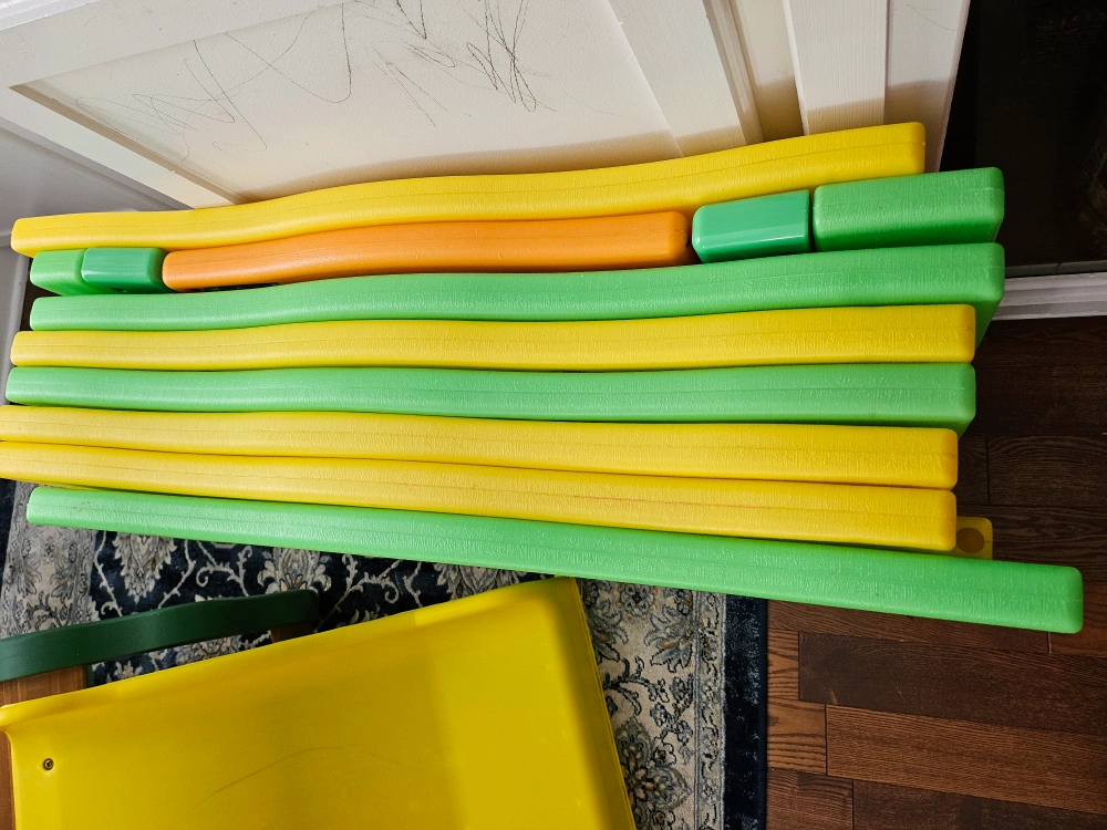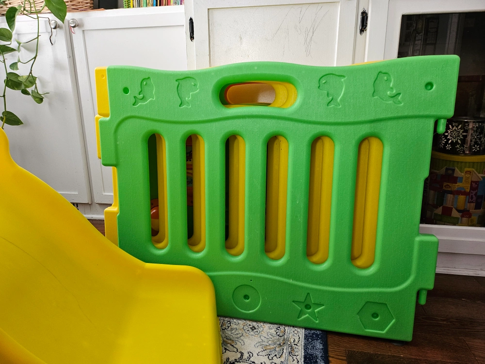 Clean playpen with panels in green, yellow, and orange. Includes a gate. Good for keeping babies and toddlers safe while they play.